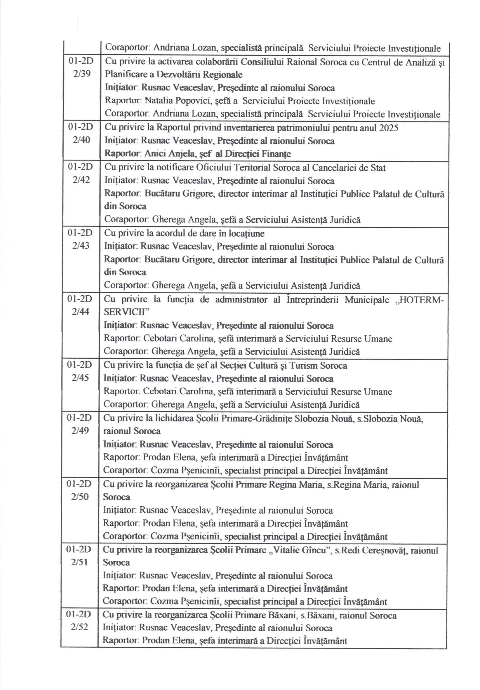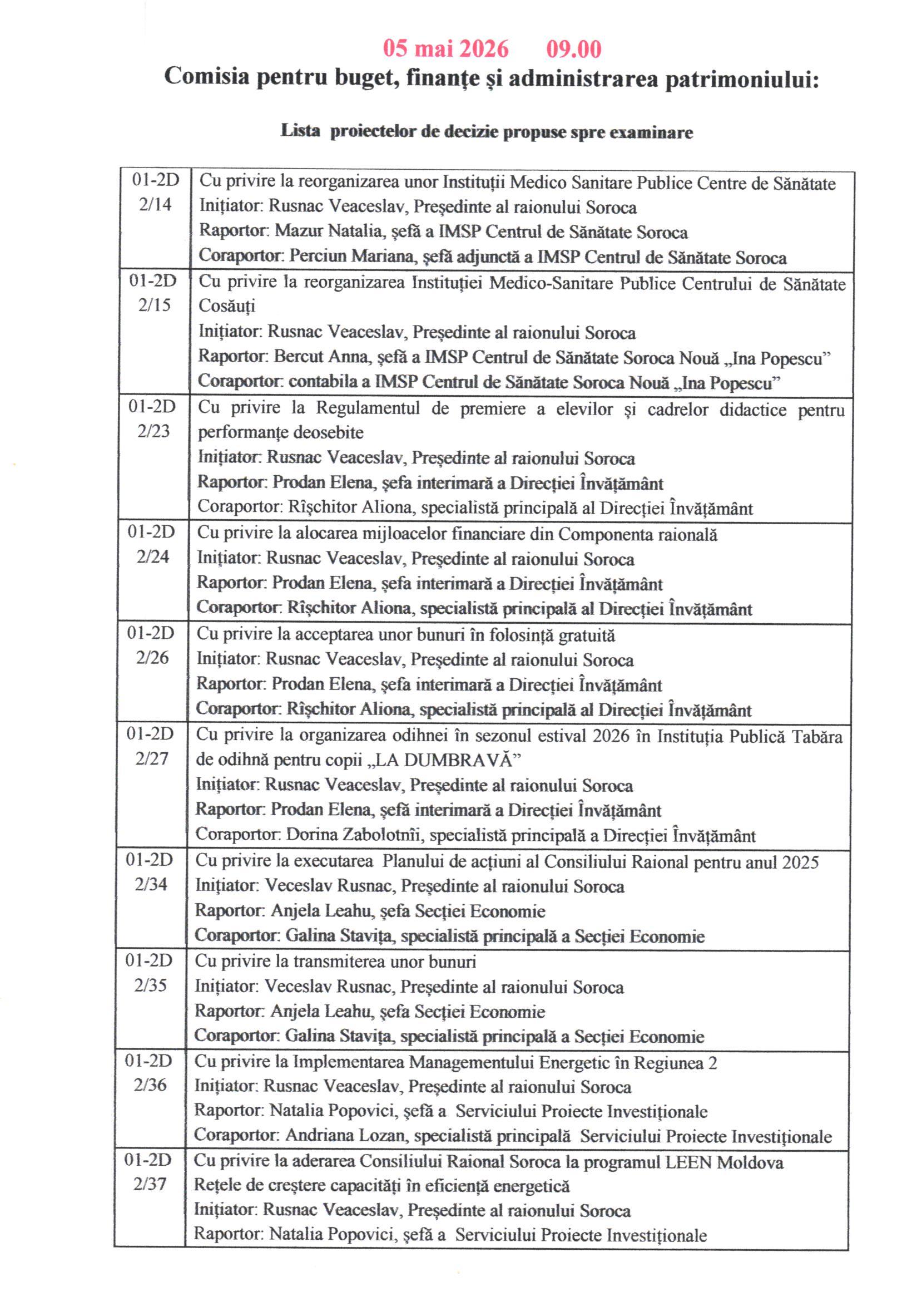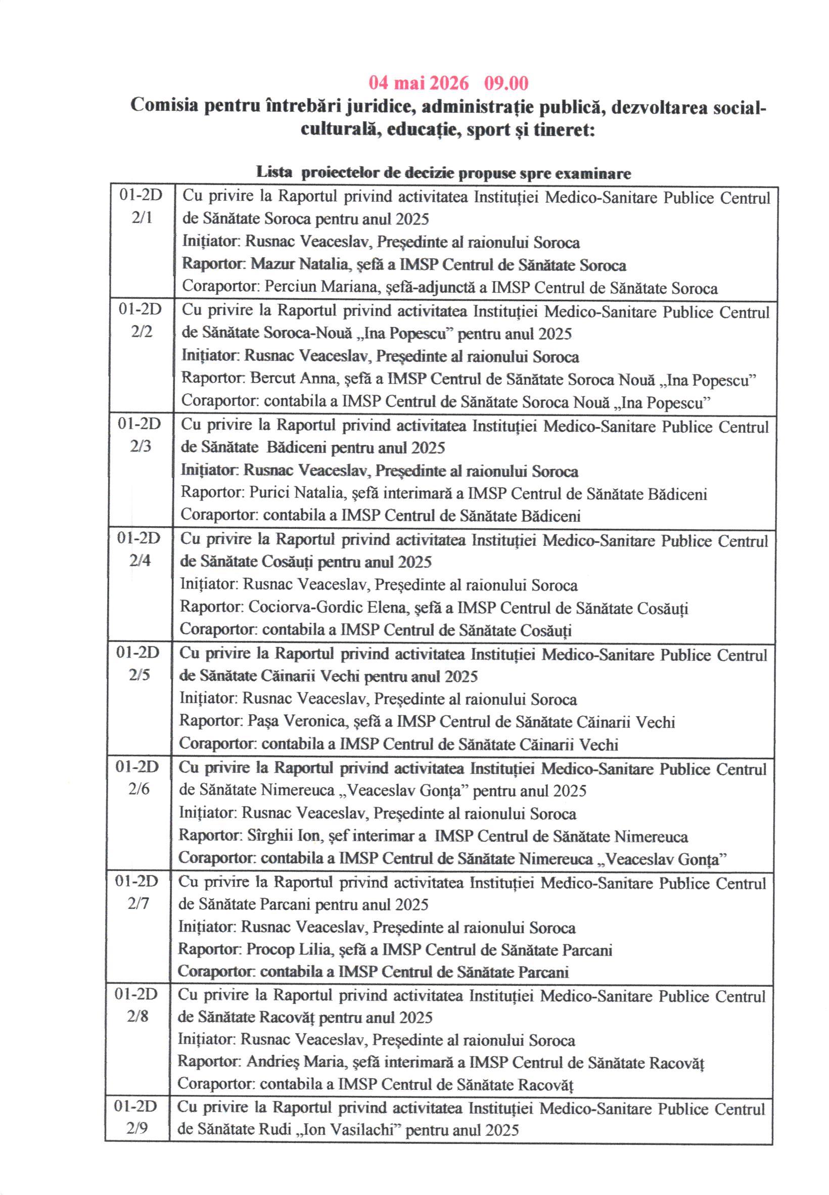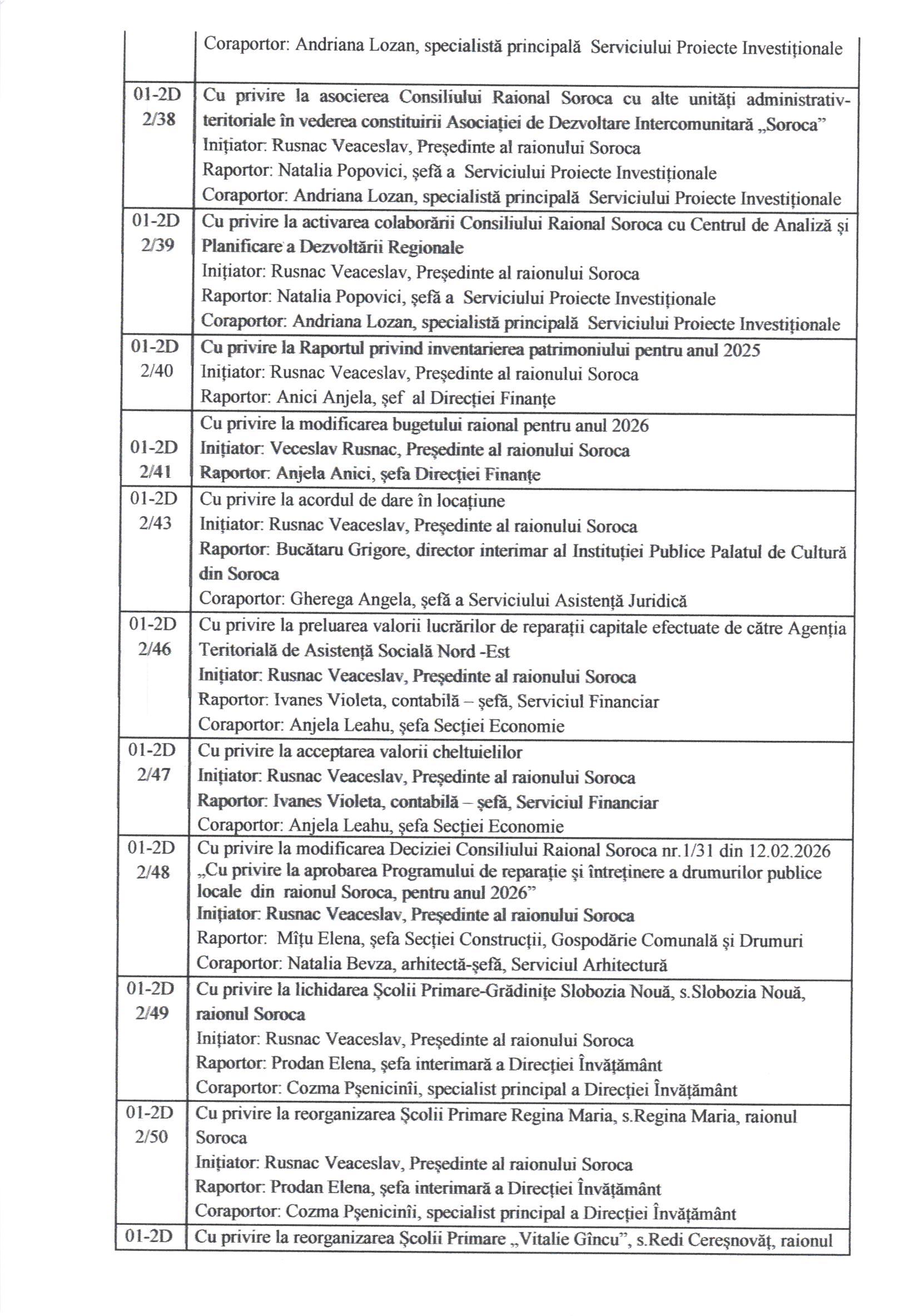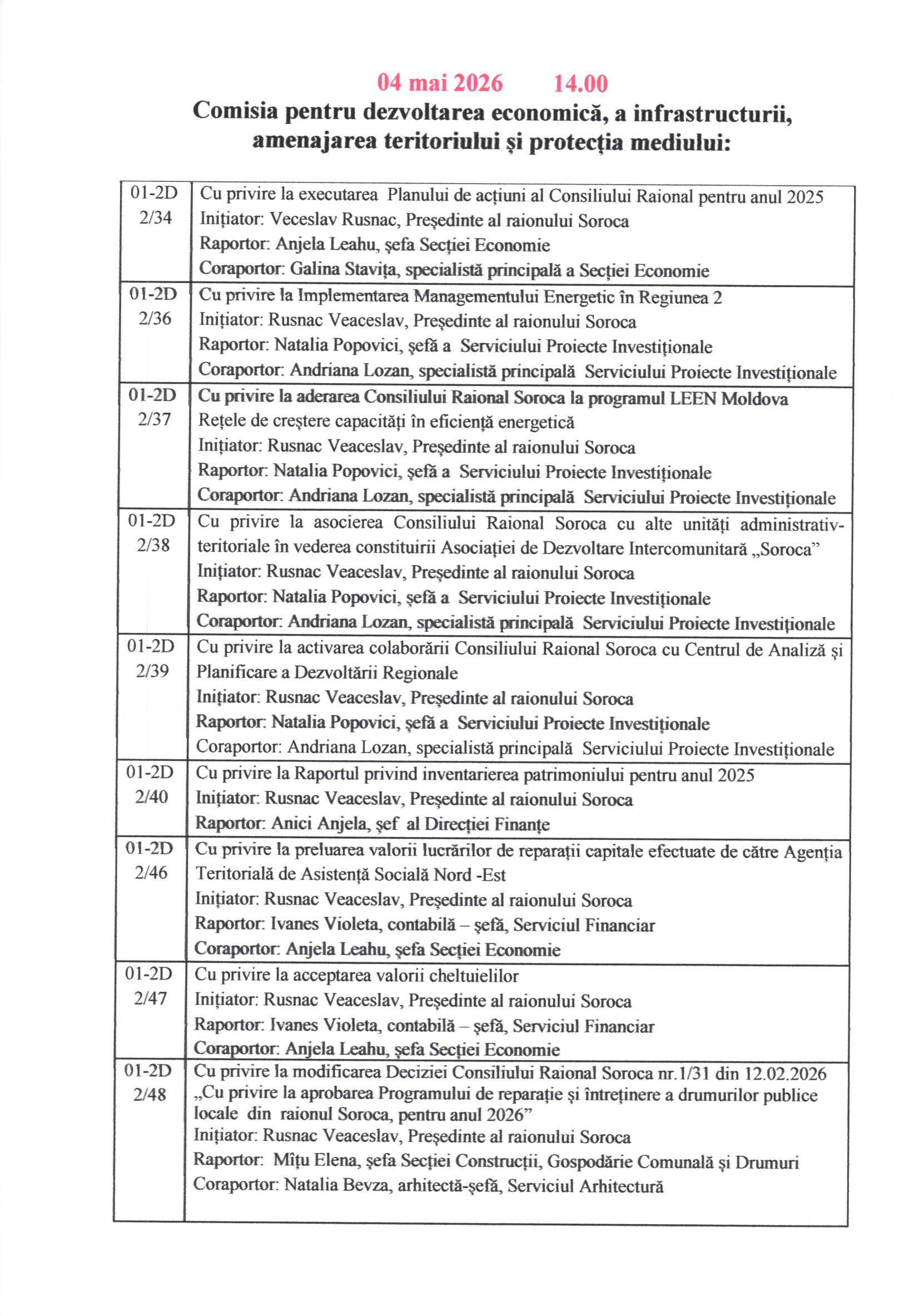 Ăn conformitate cu prevederile art.45 alin.(1) și (3) din Legea nr.436/2006 privind administrația publică locală, cu modificările ulterioare, Vă informăm, că prin Dispoziția Președintelui Raionului Soroca nr.39 din 06 aprilie 2026, cu modificările ulterioare Consiliul Raional Soroca se convoacă în ședință ordinară la data de 06 mai 2026, ora 1000 , în incinta Consiliului Raional Soroca, sala de ședințe, etajul I.