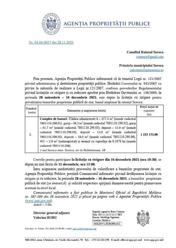 c) Data și locul desfășurării concursului: 12 februarie 2026, ora 11.00, sala de ședințe a Consiliului Raional Soroca