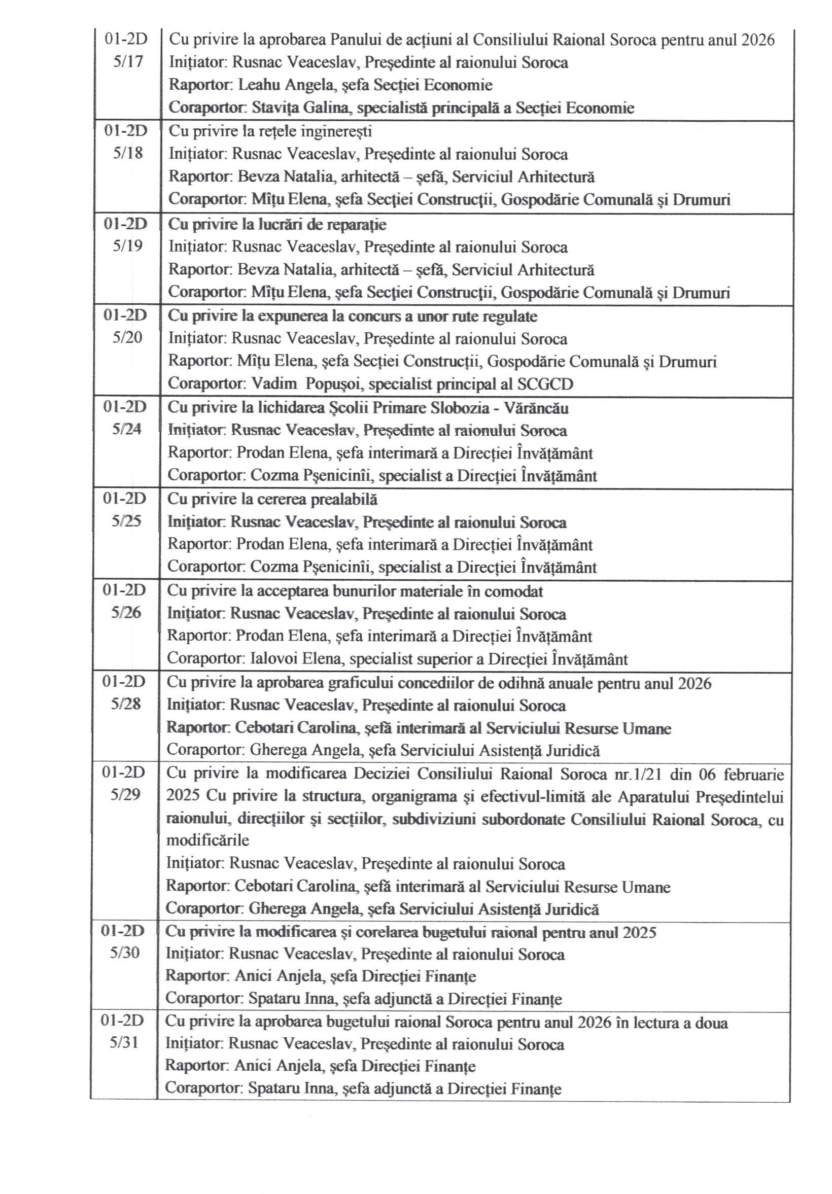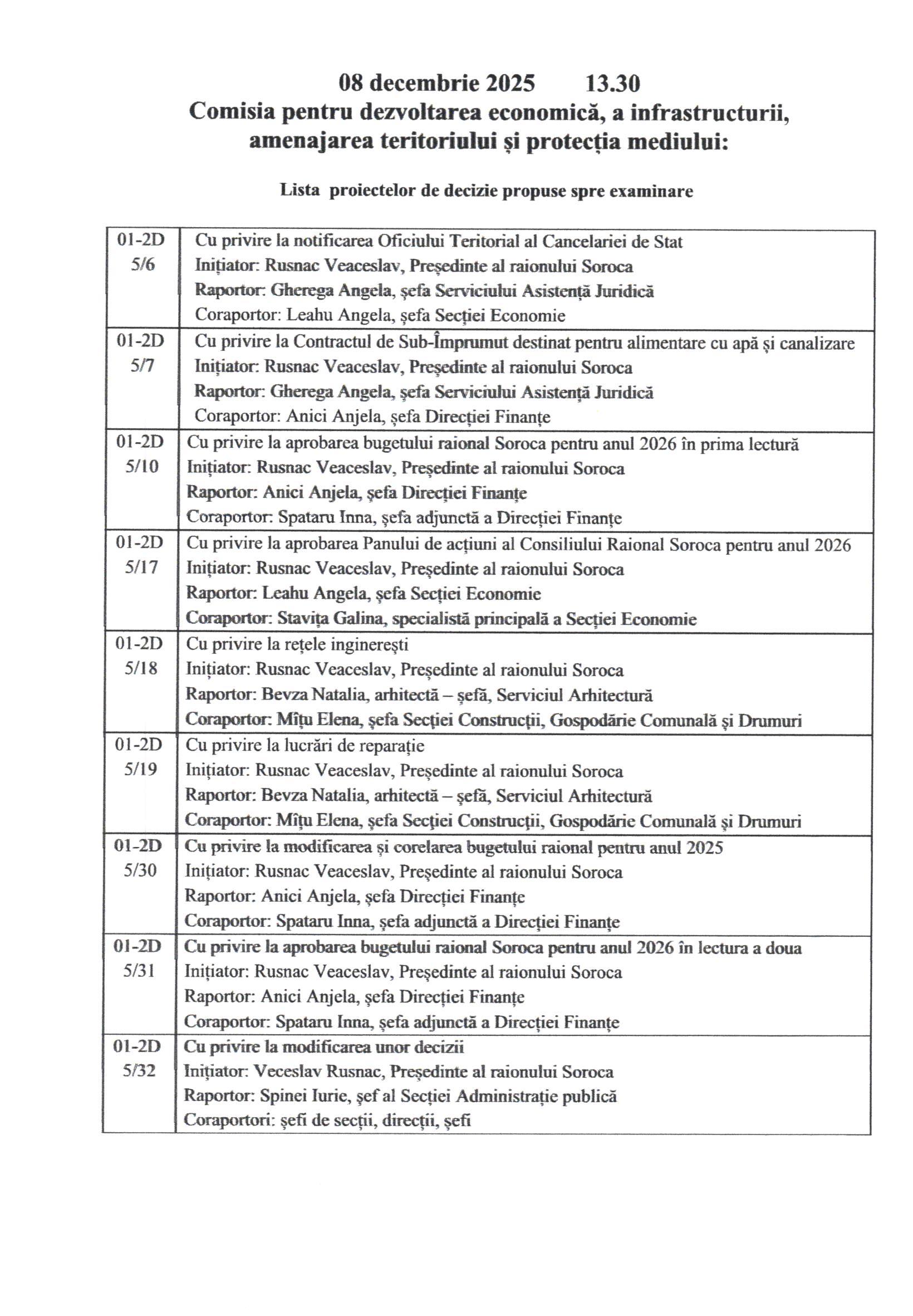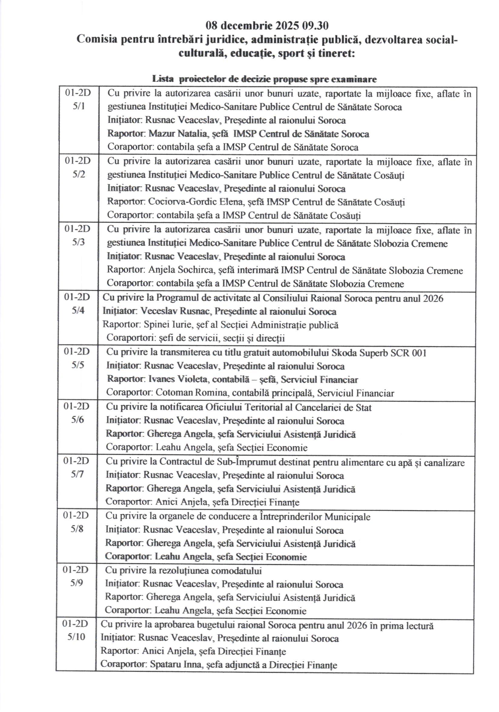 În conformitate cu prevederile art.45 alin.(1) și (3) din Legea nr.436/2006 privind administrația publică locală, cu modificările ulterioare, prin Dispoziția Președintelui Raionului Soroca nr.124 din 01 decembrie 2025, Consiliul Raional Soroca se convoacă în ședință extraordinară la data de 11 decembrie 2025, ora 1000 , în incinta Consiliului Raional Soroca, sala de ședințe, etajul I.