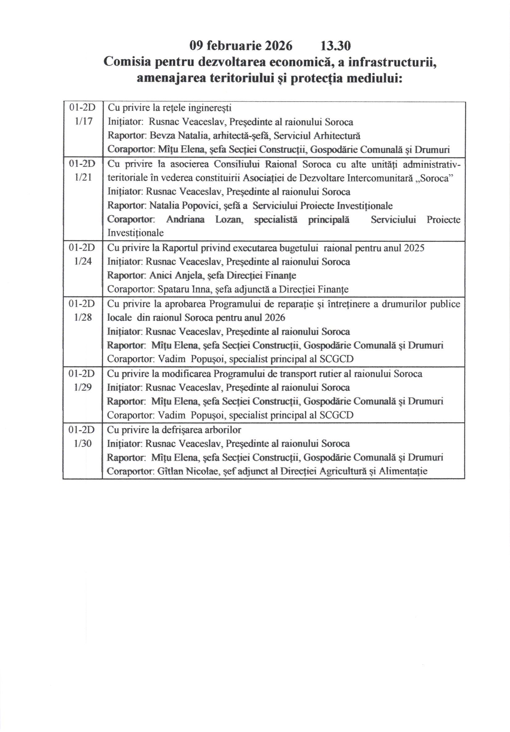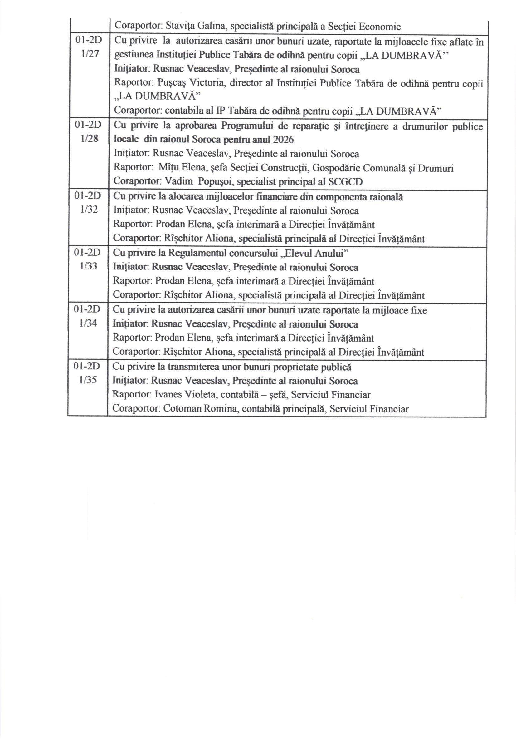 În conformitate cu prevederile art.45 alin.(1) și (3) din Legea nr.436/2006 privind administrația publică locală, cu modificările ulterioare, Vă informăm, că prin Dispoziția Președintelui Raionului Soroca nr.11 din 27 ianuarie 2026, Consiliul Raional Soroca se convoacă în ședință ordinară la data de 12 februarie 2026, ora 10.00 , în incinta Consiliului Raional Soroca, sala de ședințe, etajul I.