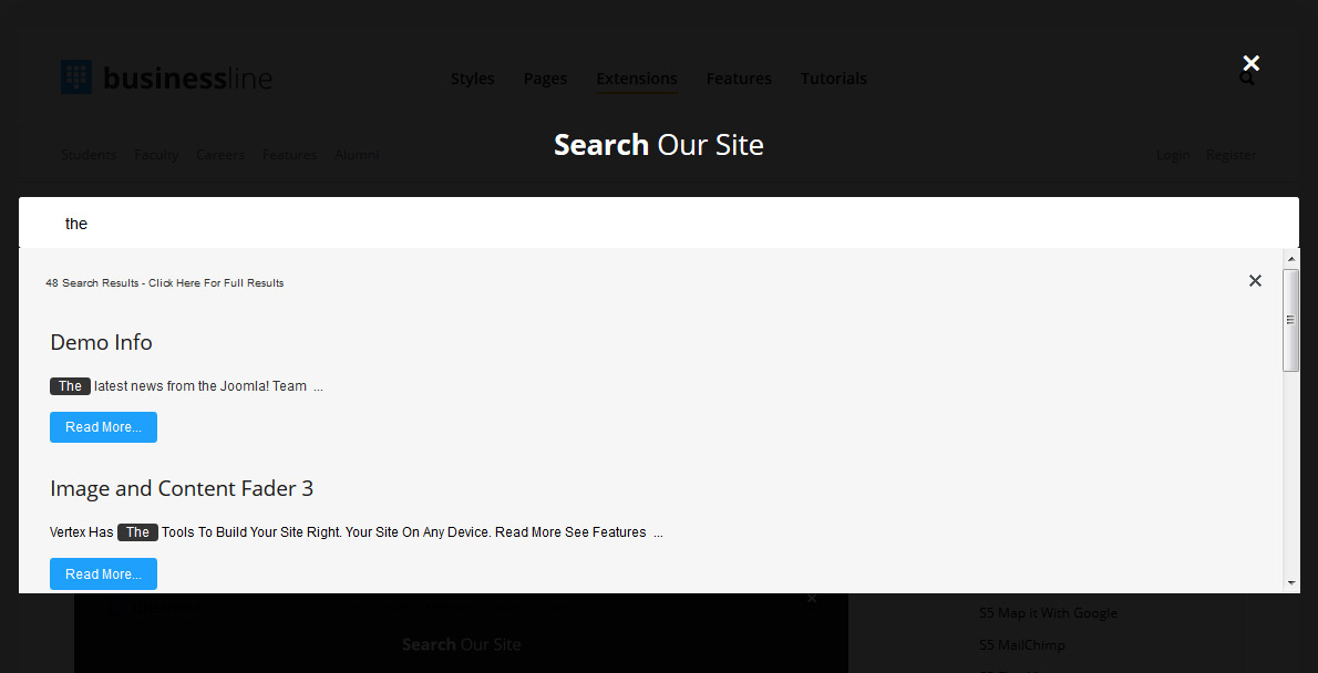 The S5 Live Search module is demo'd on this page and can be used on any Joomla template. The styling of the module shown here is customized specifically for this template with css overrides, and cannot be used with any other template. The same module can be used on any template, but with default or other styling in its place.