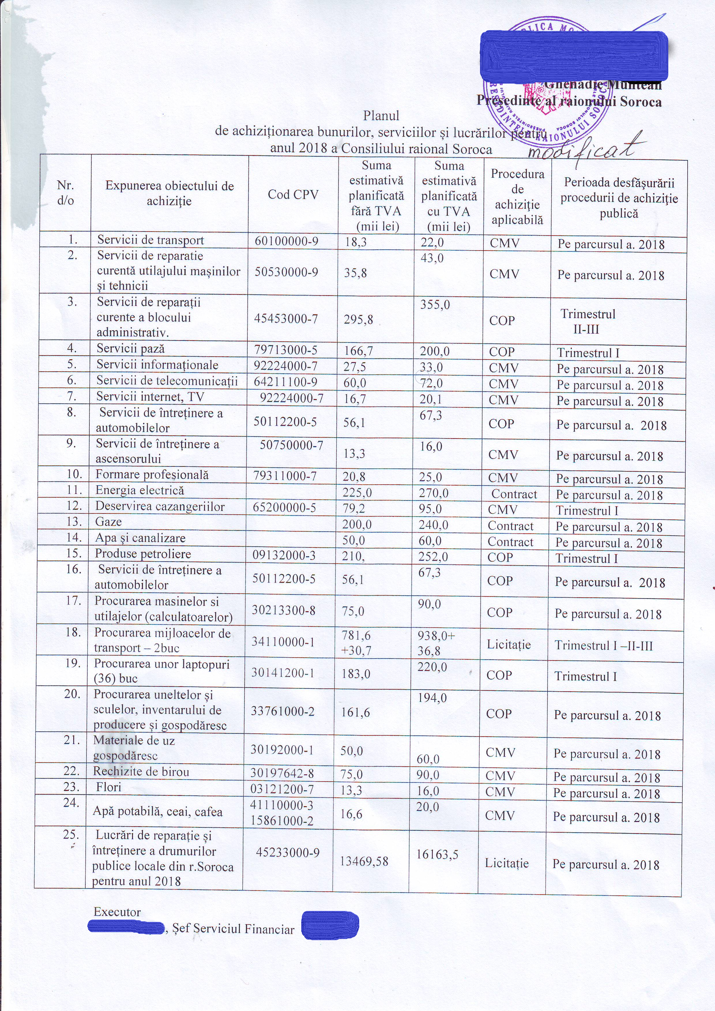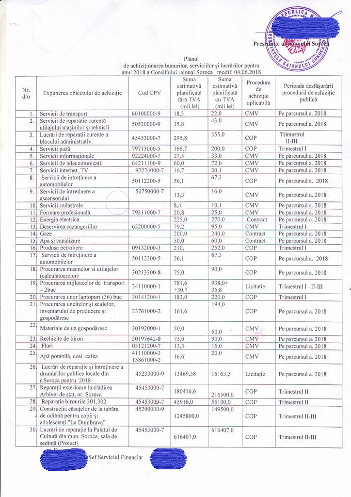 Planul de achiziționarea bunurilor ,serviciilor și lucrărilor pentru anul 2018 a Consiliului raional Soroca |