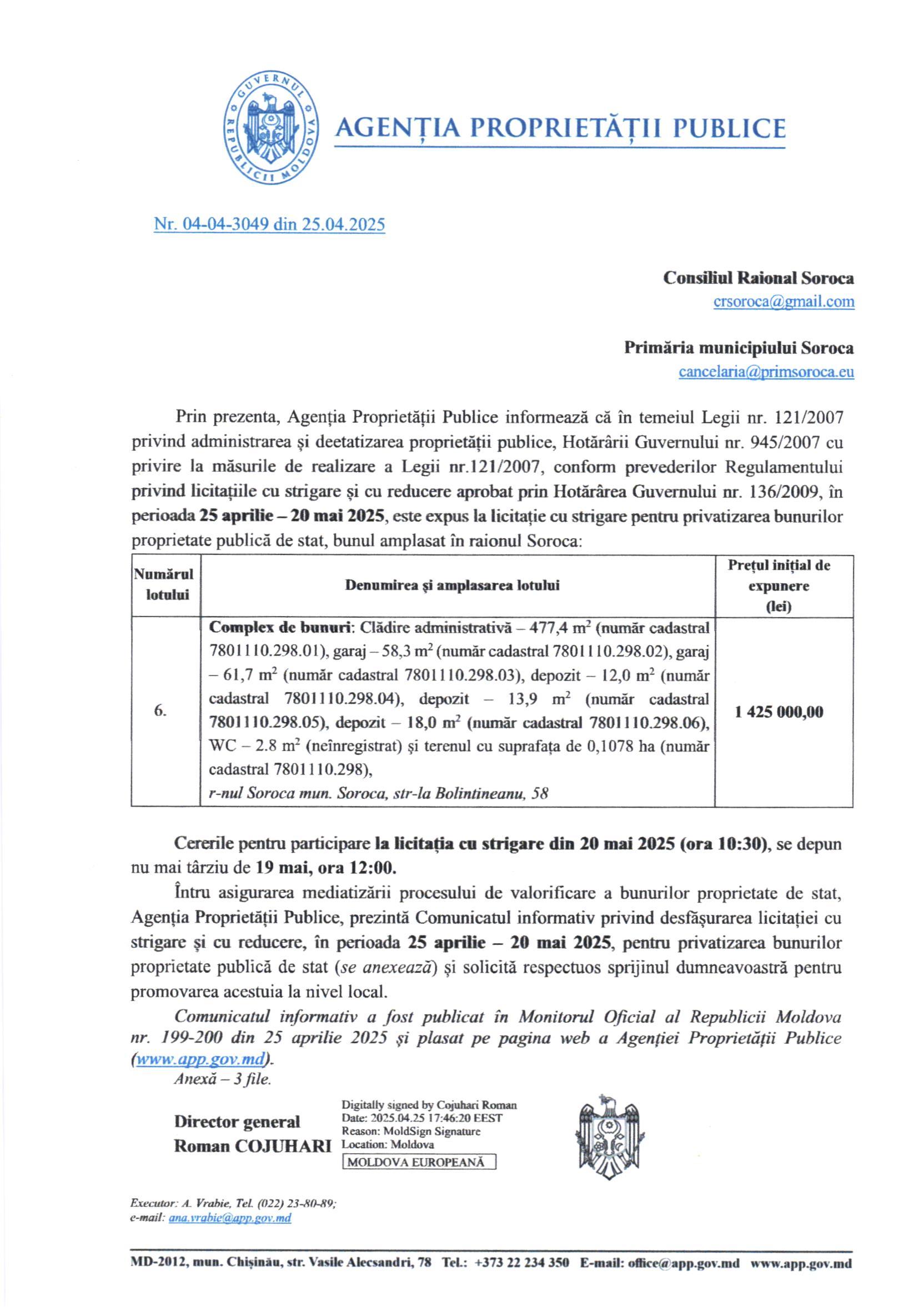 Proiectele de decizii și dosarele justificative sunt expediate pe poșta electronică a consilierilor raionali. Totodată, le puteți consulta pe pagina oficială: www.soroca.org.md la opțiunea ,,proces decizional – proiecte întrate” și la sediul Consiliului Raional Soroca, pe adresa: MD-3000, mun. Soroca, str. Ștefan cel Mare nr. 5, et. 3, biroul 503.