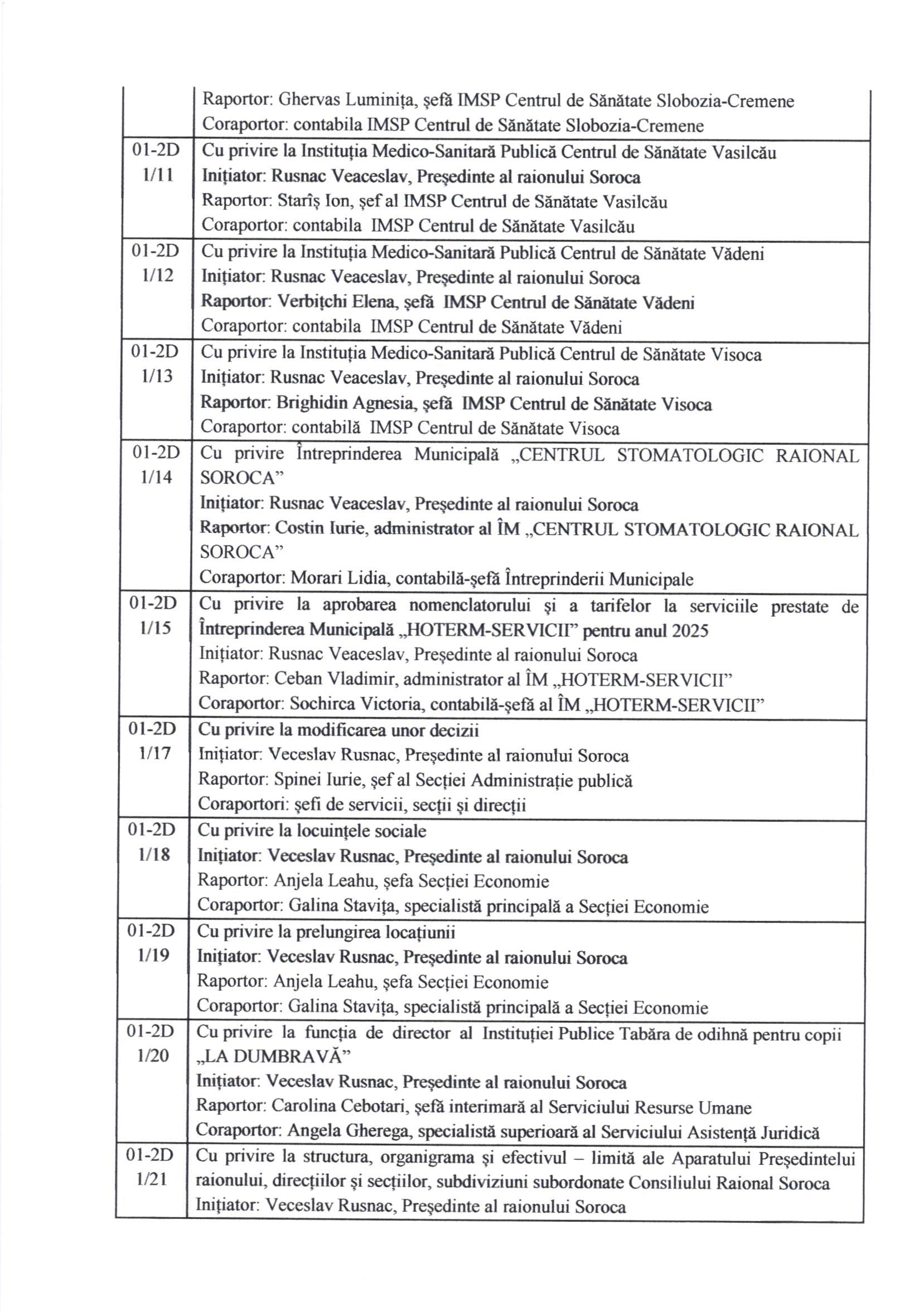 Lista proiectelor de decizii propuse spre examinare: