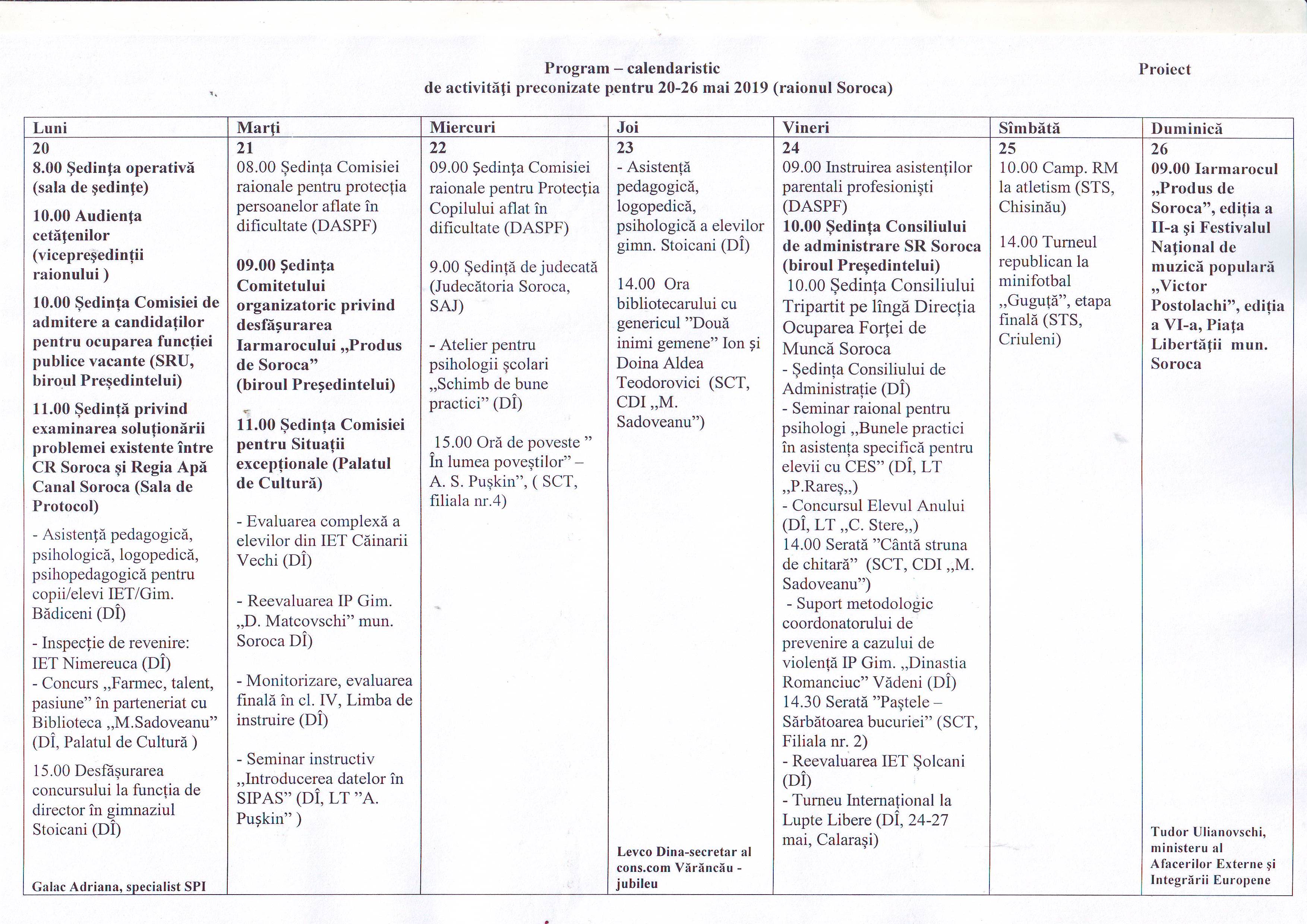 10.30-11.00 - Deschiderea oficială a Iarmarocului ,,Produs de Soroca” ed. a II-a şi a Festivalului Naţional de muzică populară ,,Victor Postolachi” ed. a VI-a 2019.