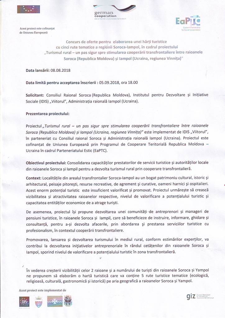 Proiectele de decizii sunt elaborate în conformitate cu legislația în vigoare. Recomandările pe marginea proiectelor de decizie ,supuse consultării publice, pot fi expediate până pe data de 21 septembrie 2018, pe adresa electronică crsoroca@gmail.com . Proiectele de decizie și nota informativă sunt disponibile pe pagina web oficială :http://soroca.md/(http://soroca.md/index.php/procesul-decizional/proiecte-intrate-in-cr) sau la sediul autorității administrației publice locale, str.Ștefan cel Mare,5.