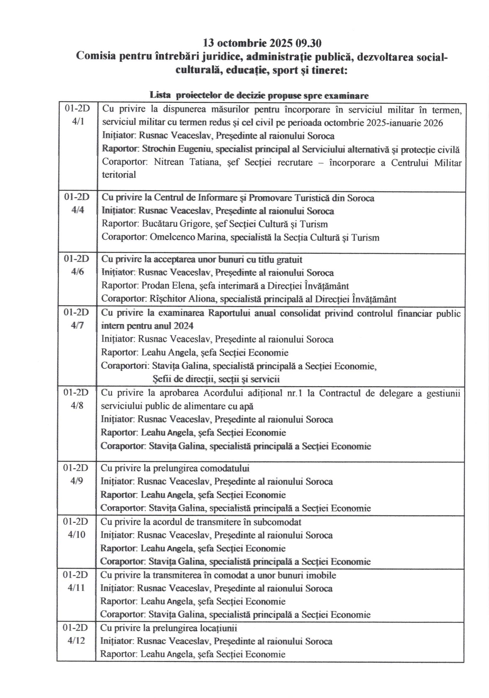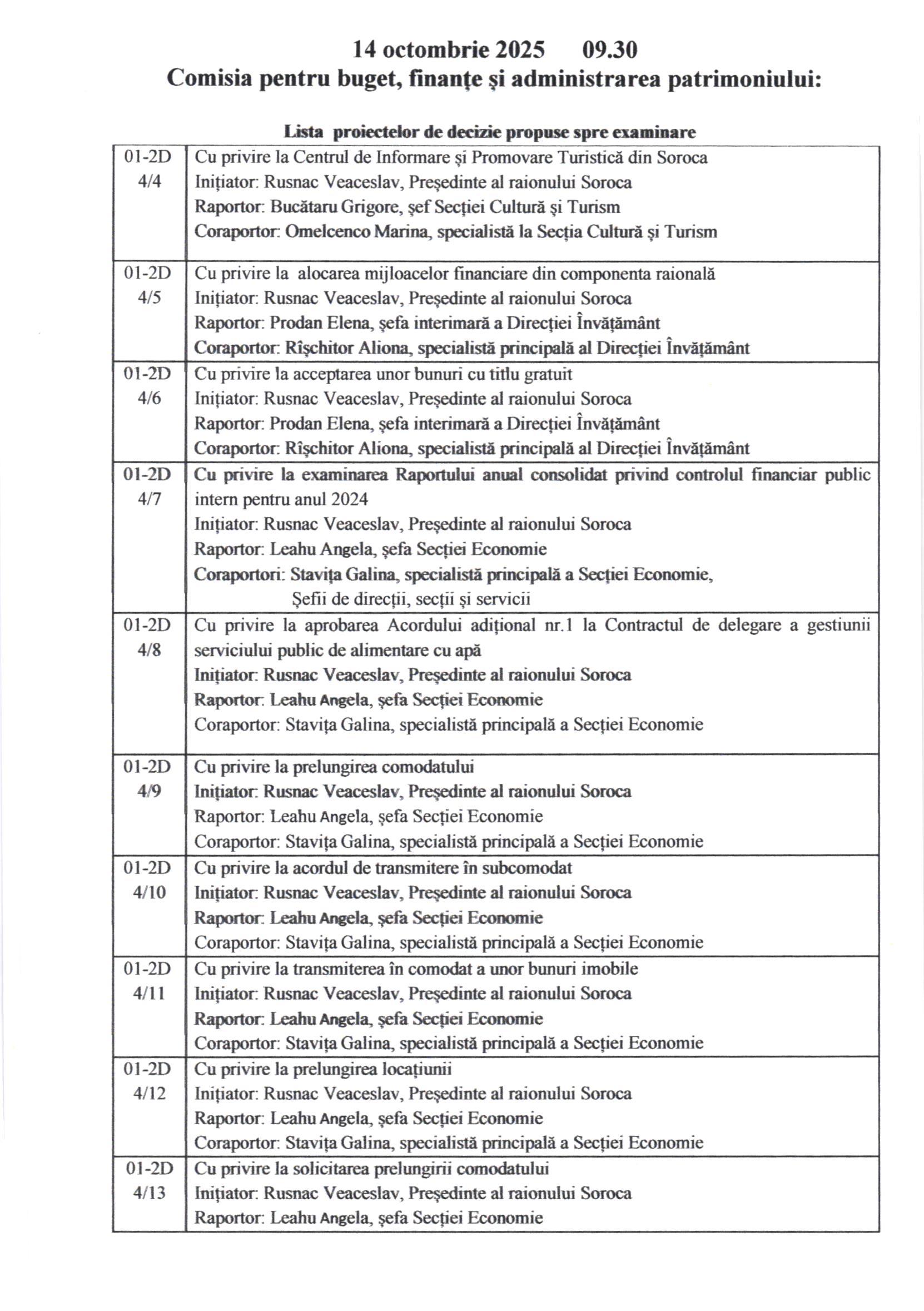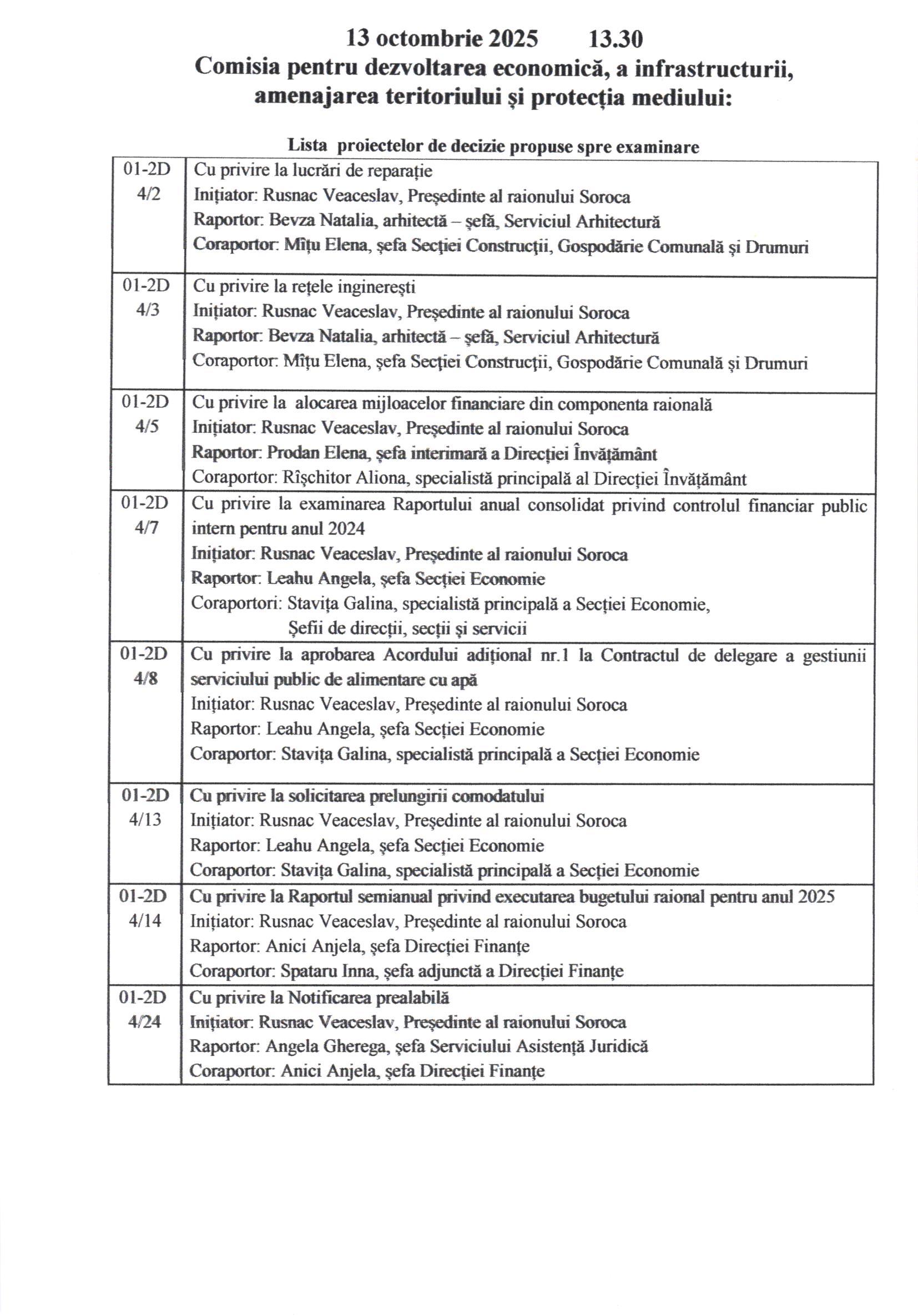 În conformitate cu prevederile art.45 alin.(1) și (3) din Legea nr.436/2006 privind administrația publică locală, cu modificările ulterioare, prin Dispoziția Președintelui Raionului Soroca nr. 101 din 02 octombrie 2025, Consiliul Raional Soroca se convoacă în ședință ordinară la data de 16 octombrie 2025, ora 10.00, în incinta Consiliului Raional Soroca, sala de ședințe, etajul I.