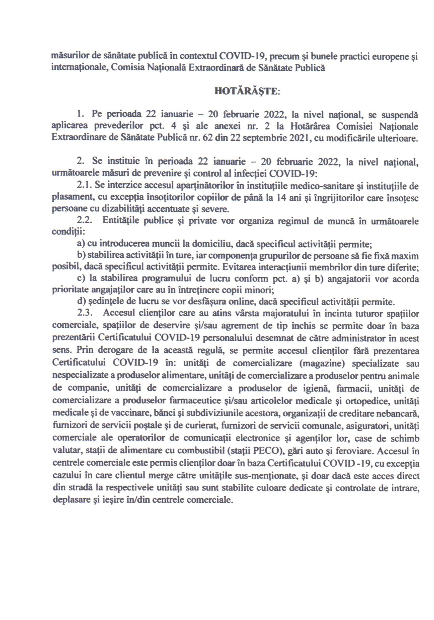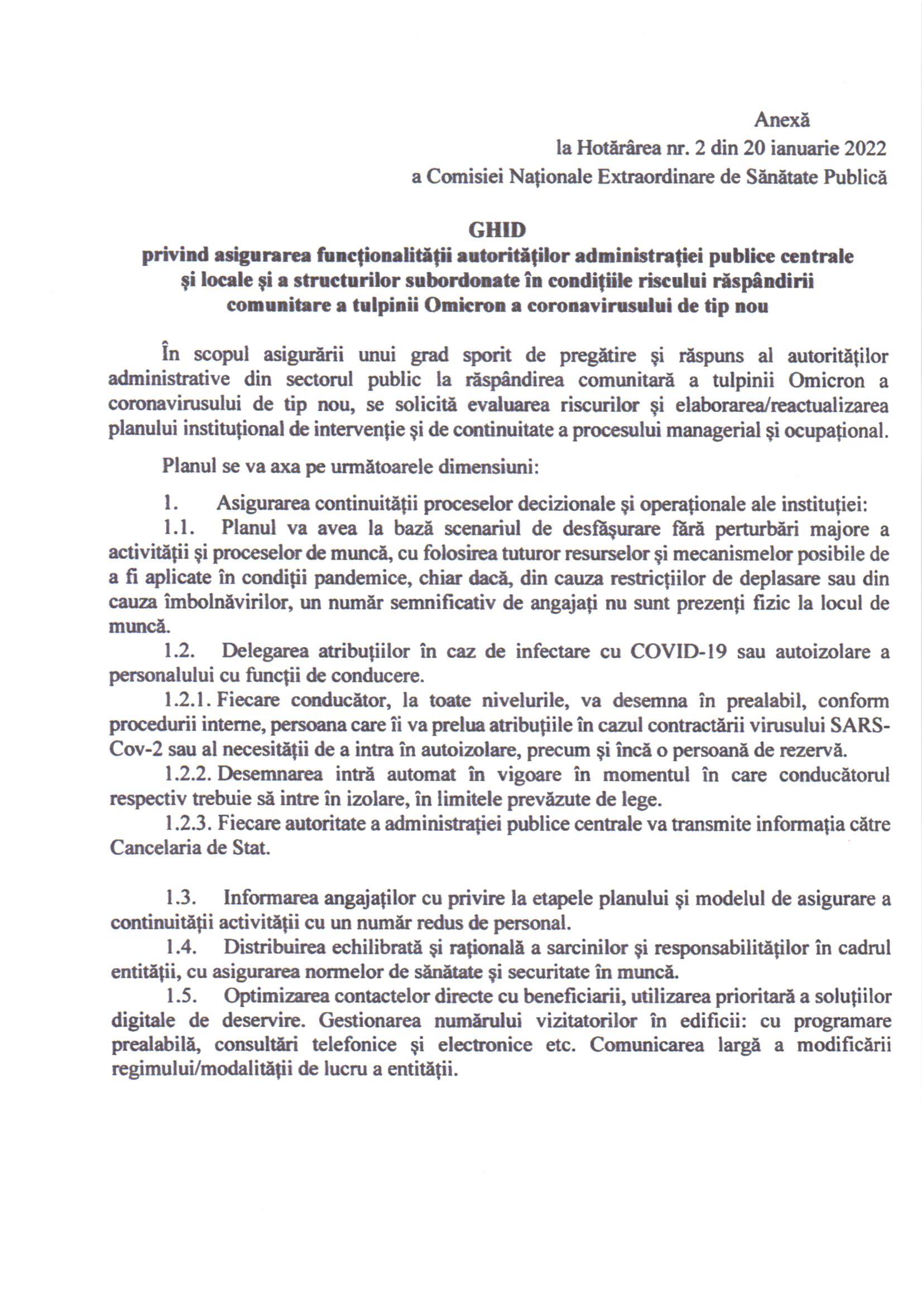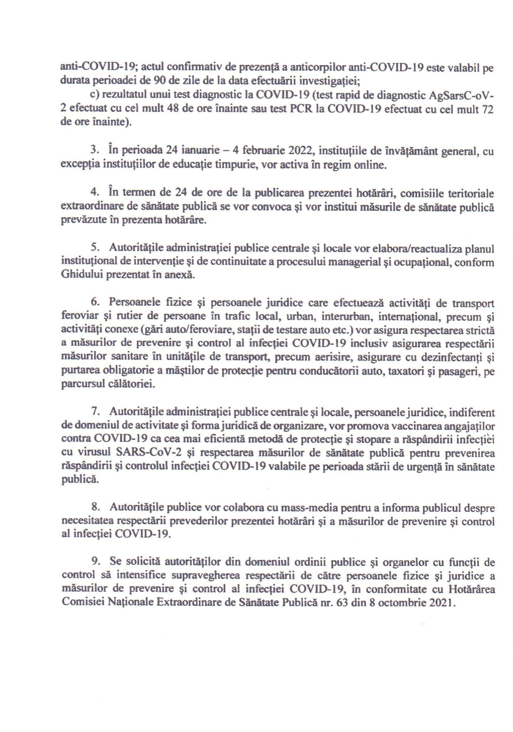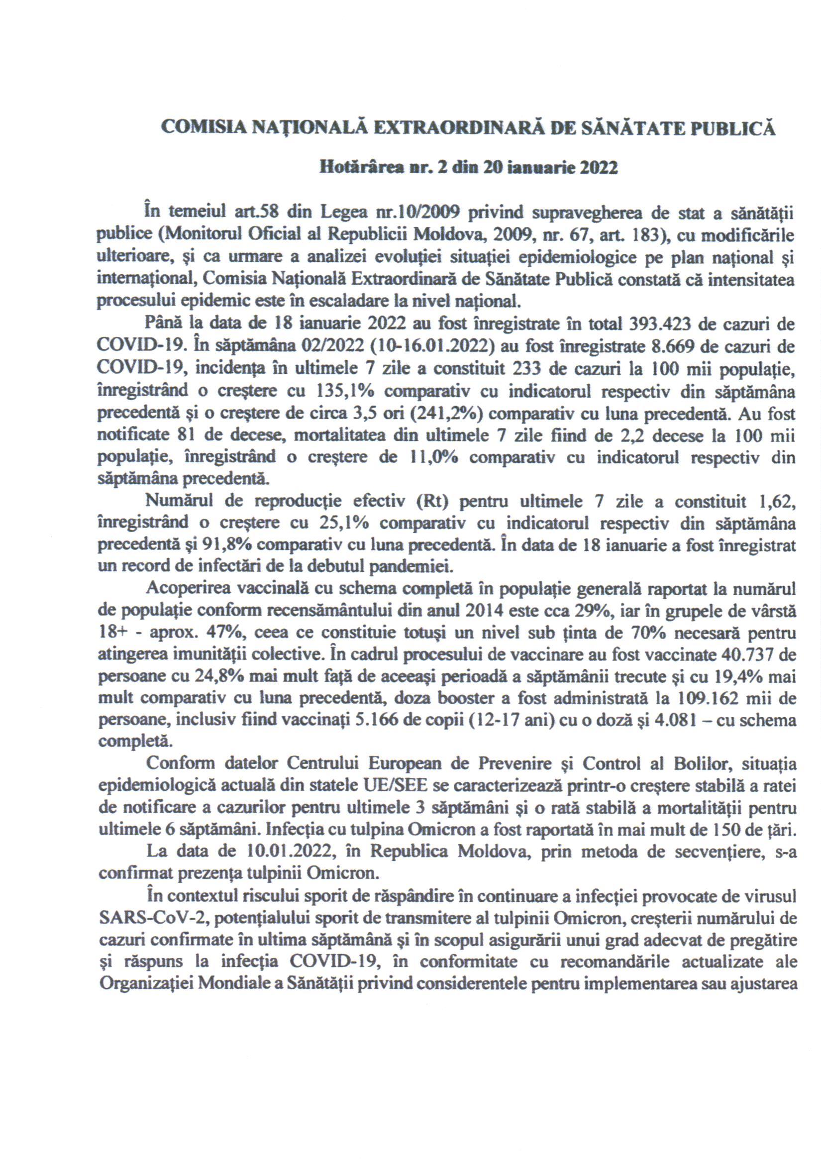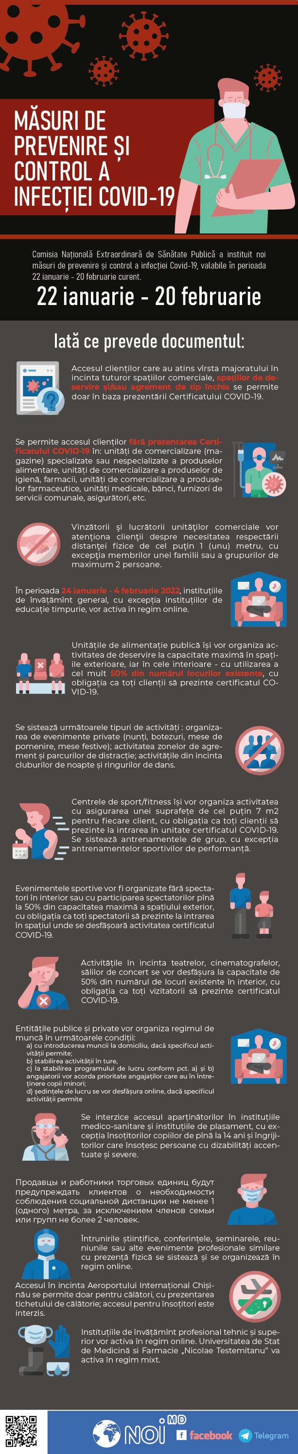 Comisia Națională Extraordinară pentru Sănătate Publică a decis să instituie, din 22 ianuarie curent, noi măsuri temporare pentru a opri răspândirea COVID-19, în special în contextul creșterii numărului de cazuri generate de noua variantă Omicron.