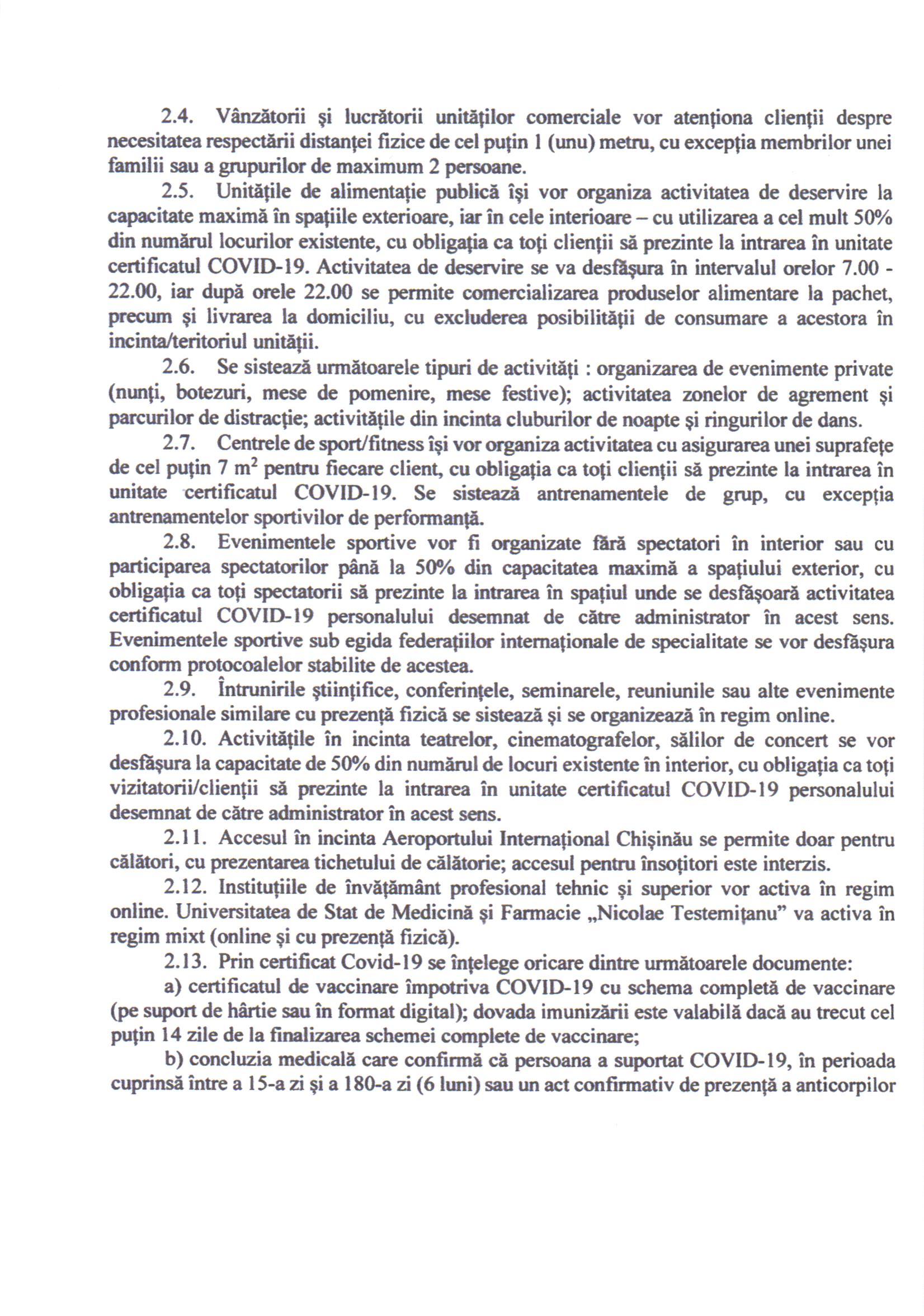 – Accesul clienților, care au atins majoratul, în orice spații comerciale, de deservire și agrement va fi permisă doar cu prezentarea certificatului COVID-19. O excepție de la această regulă se va face doar pentru accesul în unități de comercializare (magazine) specializate sau nespecializate a produselor alimentare, produselor pentru animale de companie, produselor de igienă, în farmacii, în unități de comercializare a produselor farmaceutice și/sau articolelor medicale şi ortopedice, în unități medicale și de vaccinare, bănci și subdiviziunile acestora, organizații de creditare nebancară, furnizori de servicii poștale și de curierat, furnizori de servicii comunale, asiguratori, unități comerciale ale operatorilor de comunicații electronice și agenților lor, case de schimb valutar, stațiile de alimentare cu combustibil (stațiile PECO), gări auto și feroviare.