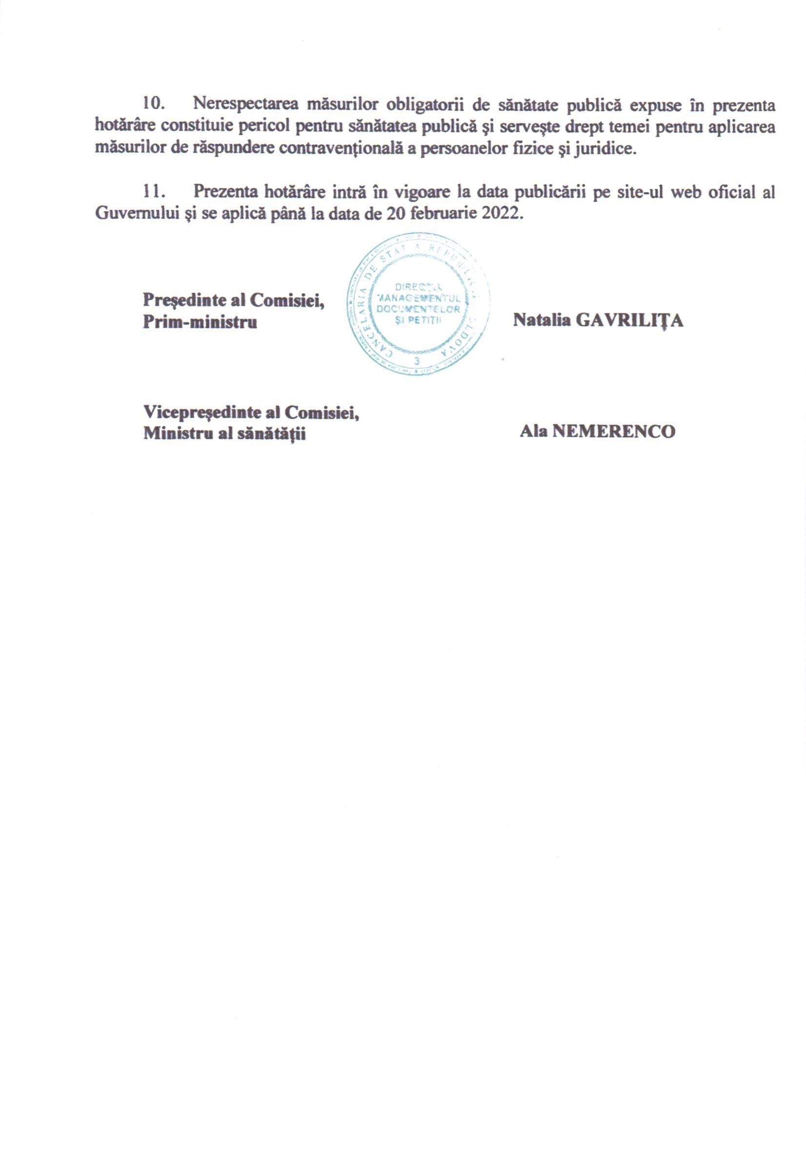 – Instituțiile de învățământ general vor activa în perioada 24 ianuarie – 4 februarie, în regim online. Cele de învățământ profesional tehnic și superior vor activa online până pe 20 februarie, cu excepția Universității de Stat de Medicină și Farmacie „Nicolae Testemițanu” care va activa în regim mixt. Tot în regim online vor fi organizate întrunirile științifice, conferințele, seminarele, reuniunile sau alte evenimente profesionale.