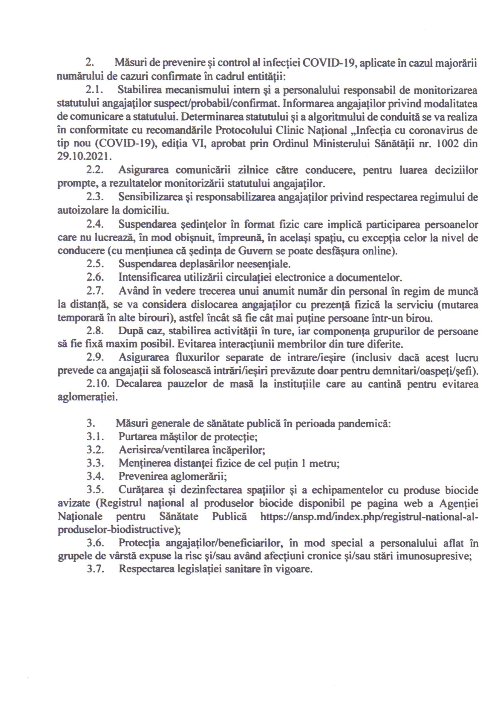 – Entitățile publice și private își vor organiza după posibilitate regimul de lucru de la distanță sau în ture. Ședințele de lucru se vor desfășura de asemenea online dacă specificul activității permite.