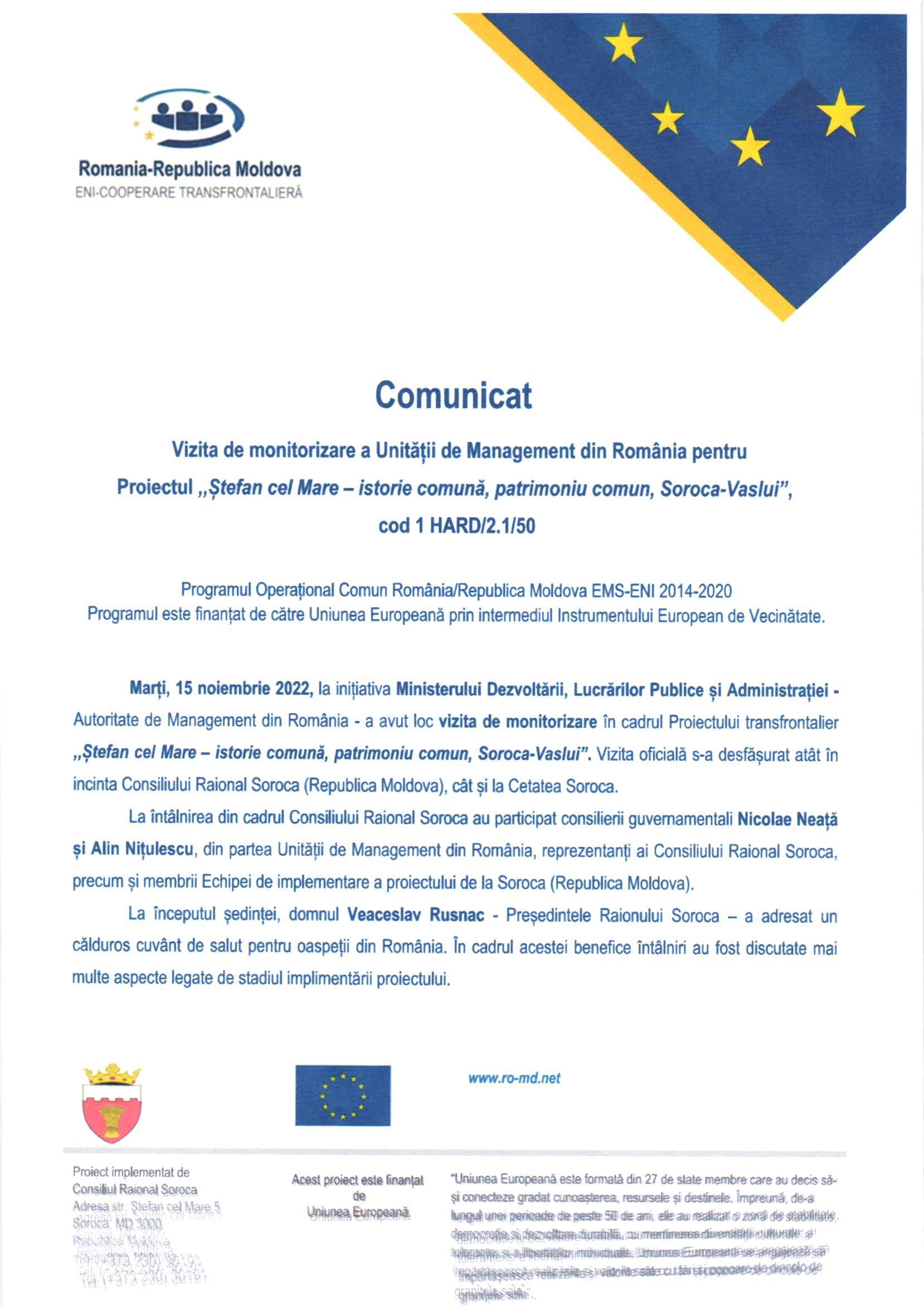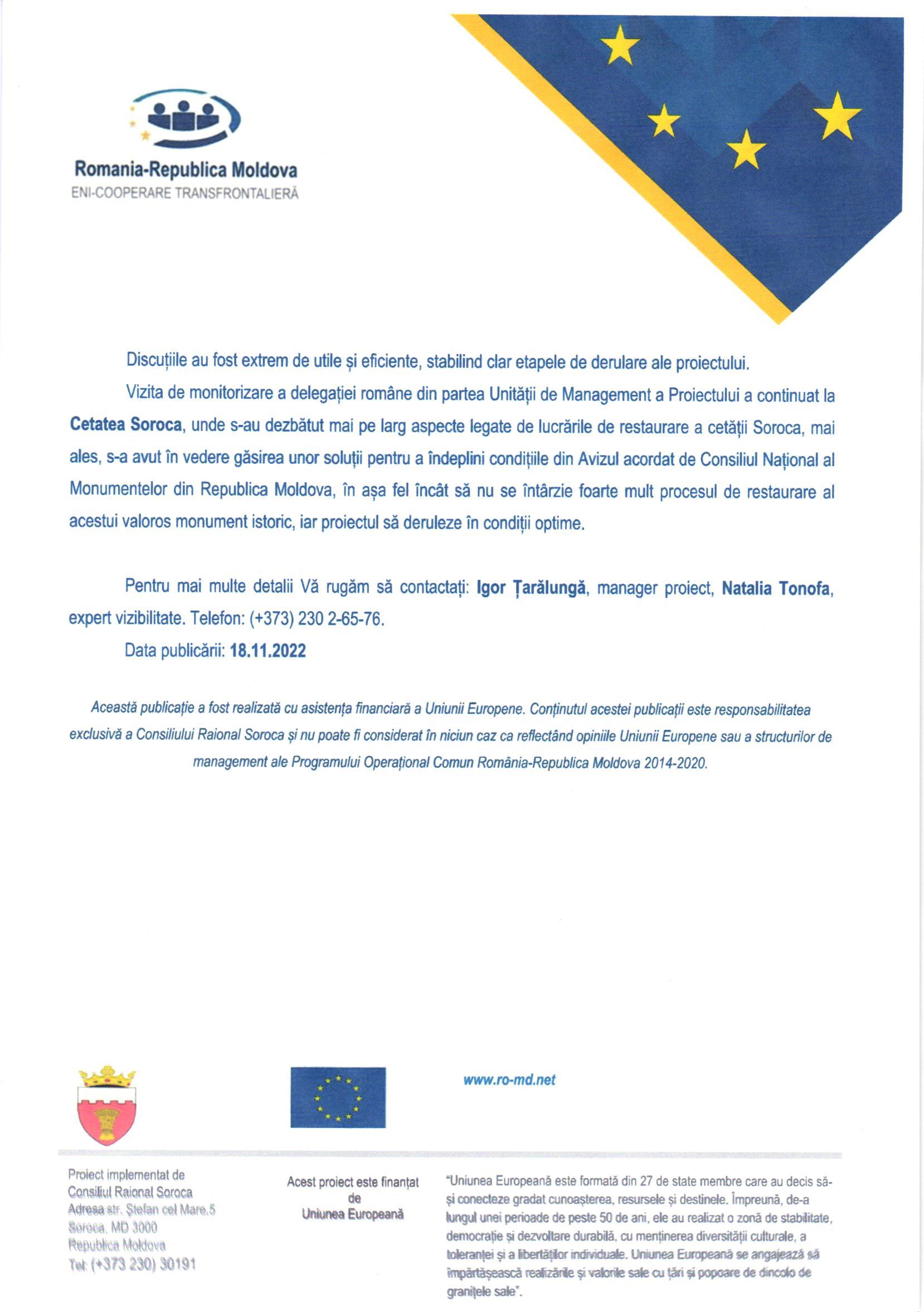 Marți, 15 noiembrie 2022, la inițiativa Ministerului Dezvoltării, Lucrărilor Publice și Administrației - Autoritate de Management din România - a avut loc vizita de monitorizare în cadrul Proiectului transfrontalier ,,Ștefan cel Mare – istorie comună, patrimoniu comun, Soroca-Vaslui”. Vizita oficială s-a desfășurat atât în incinta Consiliului Raional Soroca (Republica Moldova), cât și la Cetatea Soroca.