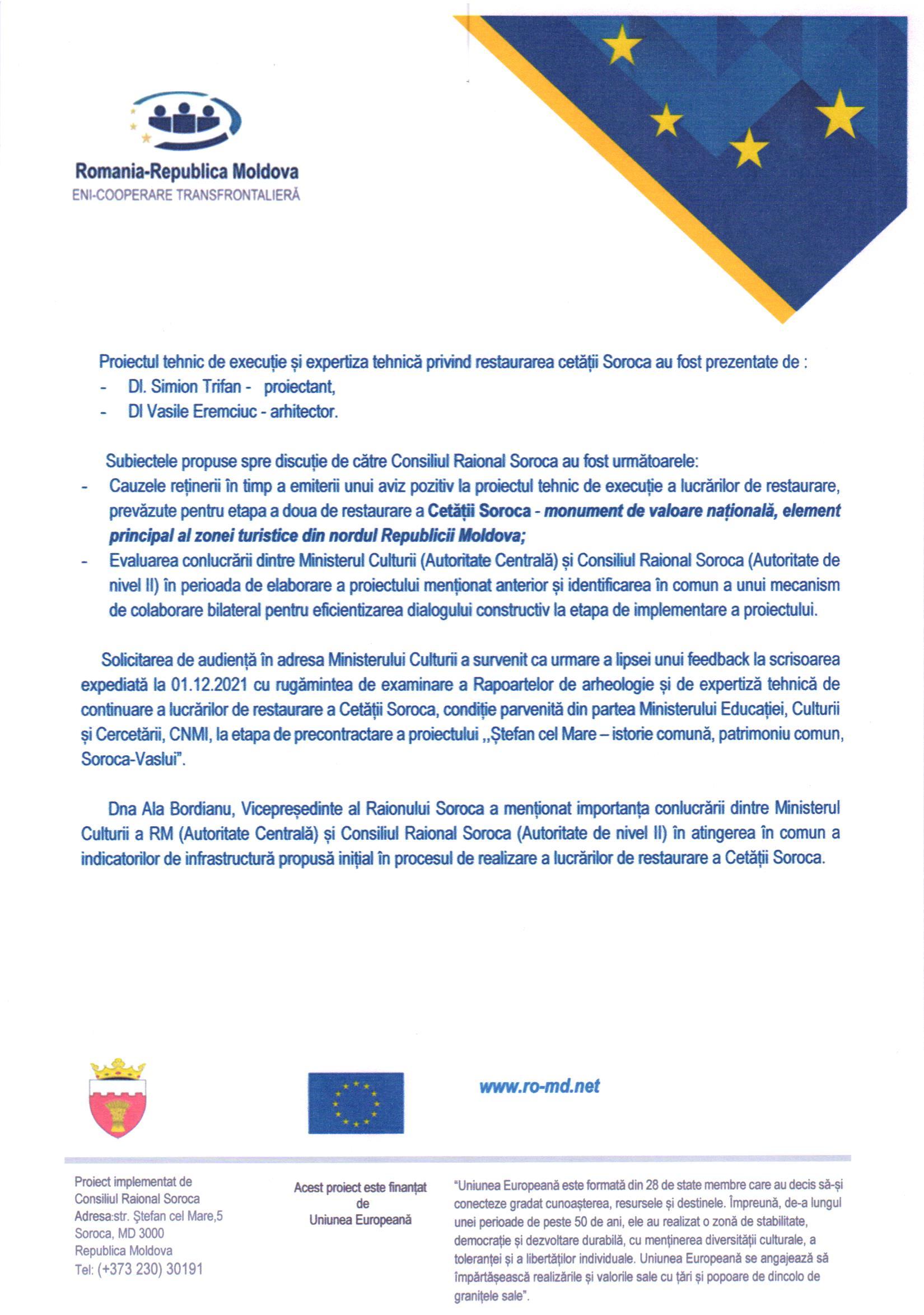Solicitarea de audiență în adresa Ministerului Culturii a survenit ca urmare a lipsei unui feedback la scrisoarea expediată la 01.12.2021 cu rugămintea de examinare a Rapoartelor de arheologie și de expertiză tehnică de continuare a lucrărilor de restaurare a Cetății Soroca, condiție parvenită din partea Ministerului Educației, Culturii și Cercetării, CNMI, la etapa de precontractare a proiectului ,,Ștefan cel Mare – istorie comună, patrimoniu comun, Soroca-Vaslui”.