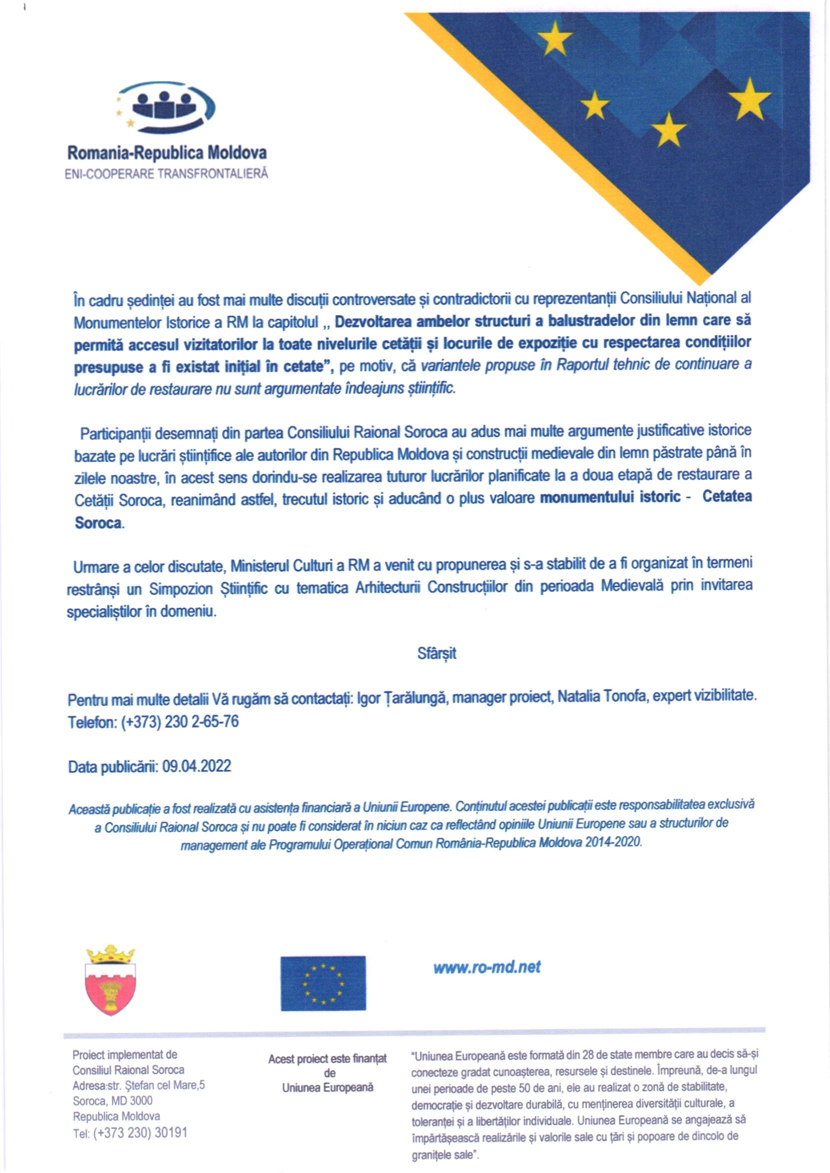 Pentru implementarea în termeni stabiliții (01 aprilie 2021 – 31 martie 2023) a proiectului ,,Ștefan cel Mare – istorie comună, patrimoniu comun, Soroca-Vaslui” finanțat de Uniunea Europeană prin intermediul Programului Operațional Comun România - Republica Moldova EMS-ENI 2014-2020, precum și a realizarea întru totul a indicatorilor propuși pe proiect, la solicitarea Consiliului Raional Soroca în incinta Ministerul Culturii a RM la data 29.03.2022 a fost desfășurată ședința interministerială în următoarea componență: