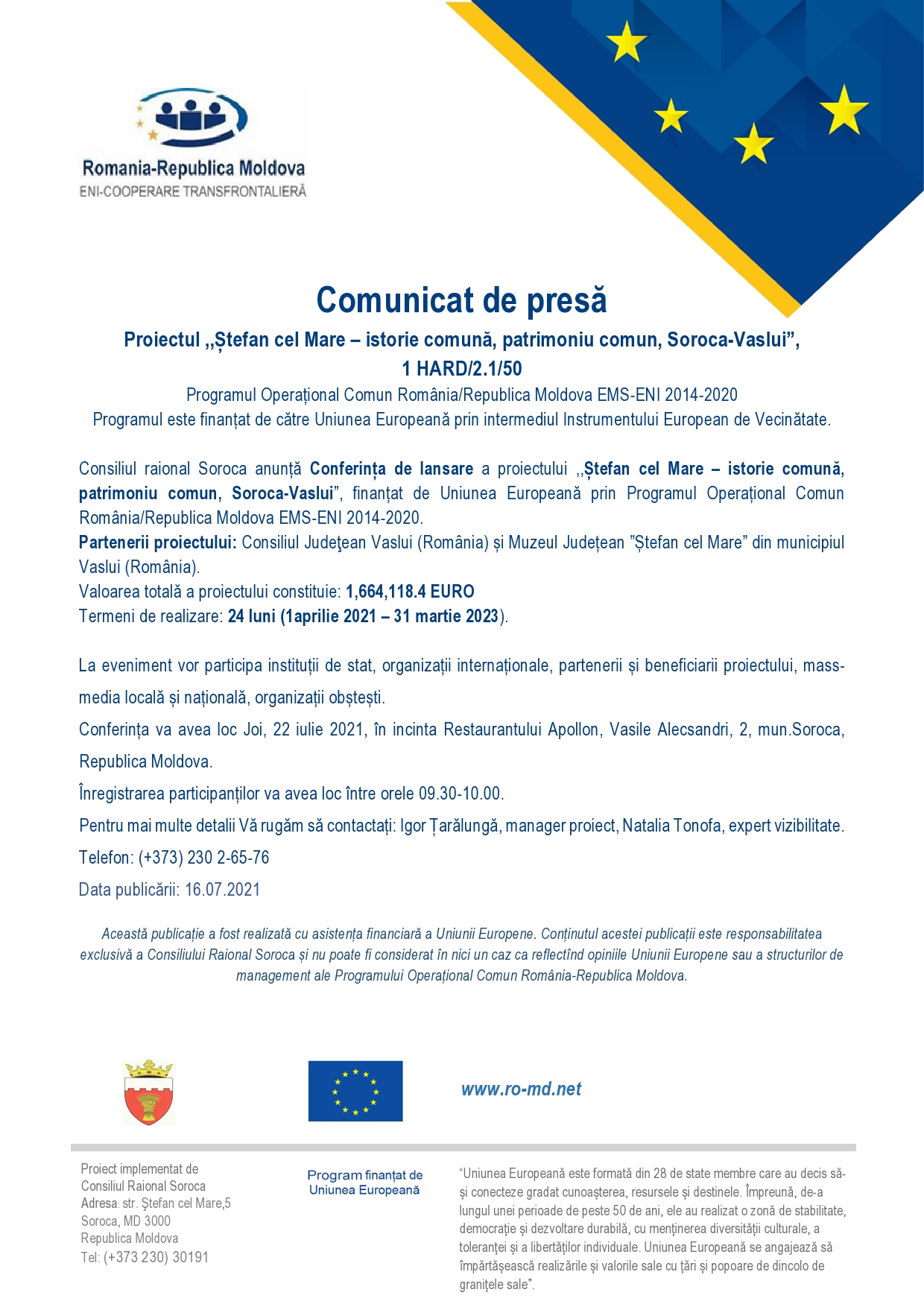 La data de 22 iulie 2021, ora 10.00 în incinta Restaurantului Apollon, str.Vasile Alecsandri, 2, mun.Soroca, Consiliul raional Soroca a desfășurat Conferința de lansare a proiectului ,,Ștefan cel Mare – istorie comună, patrimoniu comun, Soroca-Vaslui”, finanțat de Uniunea Europeană prin Programul Operațional Comun România/Republica Moldova EMS-ENI 2014-2020.