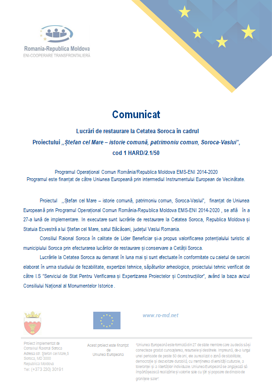 Proiectul ,,Ștefan cel Mare – istorie comună, patrimoniu comun, Soroca-Vaslui”, finanțat de Uniunea Europeană prin Programul Operațional Comun România-Republica Moldova EMS-ENI 2014-2020 , se află în a 27-a lună de implementare. În executare sunt lucrările de restaurare la Cetatea Soroca, Republica Moldova și Statuia Ecvestră a lui Ștefan cel Mare, satul Băcăoani, județul Vaslui Romania.