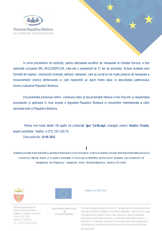 Această publicație a fost realizată cu asistența financiară a Uniunii Europene. Conținutul acestei publicații este responsabilitatea exclusivă a Consiliului Raional Soroca și nu poate fi considerat în niciun caz ca reflectând opiniile Uniunii Europene sau a structurilor de management ale Programului Operațional Comun România-Republica Moldova 2014-2020.