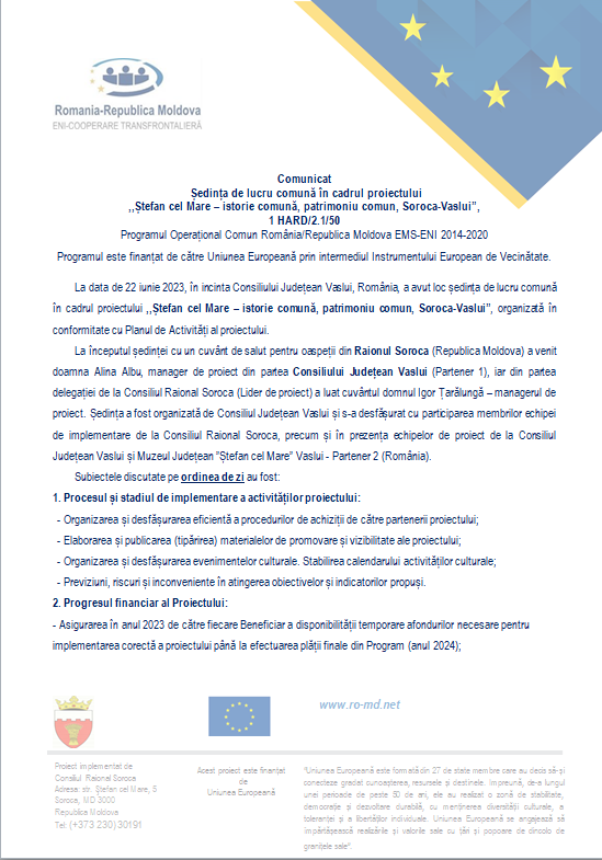 La data de 22 iunie 2023, în incinta Consiliului Județean Vaslui, România, a avut loc ședința de lucru comună în cadrul proiectului ,,Ștefan cel Mare – istorie comună, patrimoniu comun, Soroca-Vaslui”, organizată în conformitate cu Planul de Activități al proiectului.
