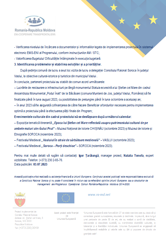 Proiectului ,,Ștefan cel Mare – istorie comună, patrimoniu comun, Soroca-Vaslui”,