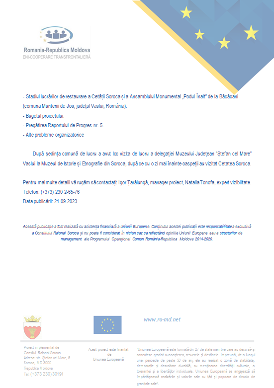 La data de 14 septembrie 2023, în incinta Consiliului Raional Soroca, Republica Moldova, a avut loc ședința de lucru comună în cadrul proiectului ,,Ștefan cel Mare – istorie comună, patrimoniu comun, Soroca-Vaslui”, organizată în conformiate cu Planul de Activități a proiectului.