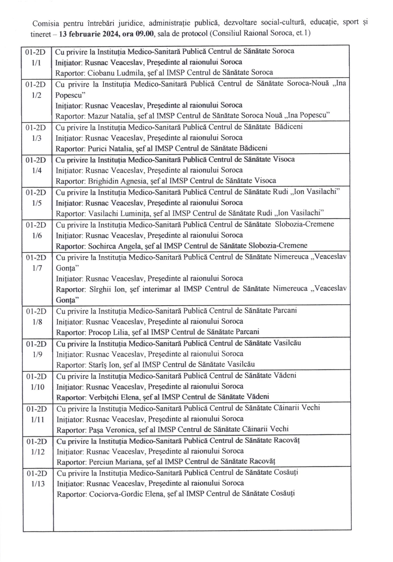 Comisia pentru întrebări juridice, administrație publică, dezvoltare social-cultură, educație, sport și tineret – 13 februarie 2024, ora 09.00, sala de protocol (Consiliul Raional Soroca, et.1)