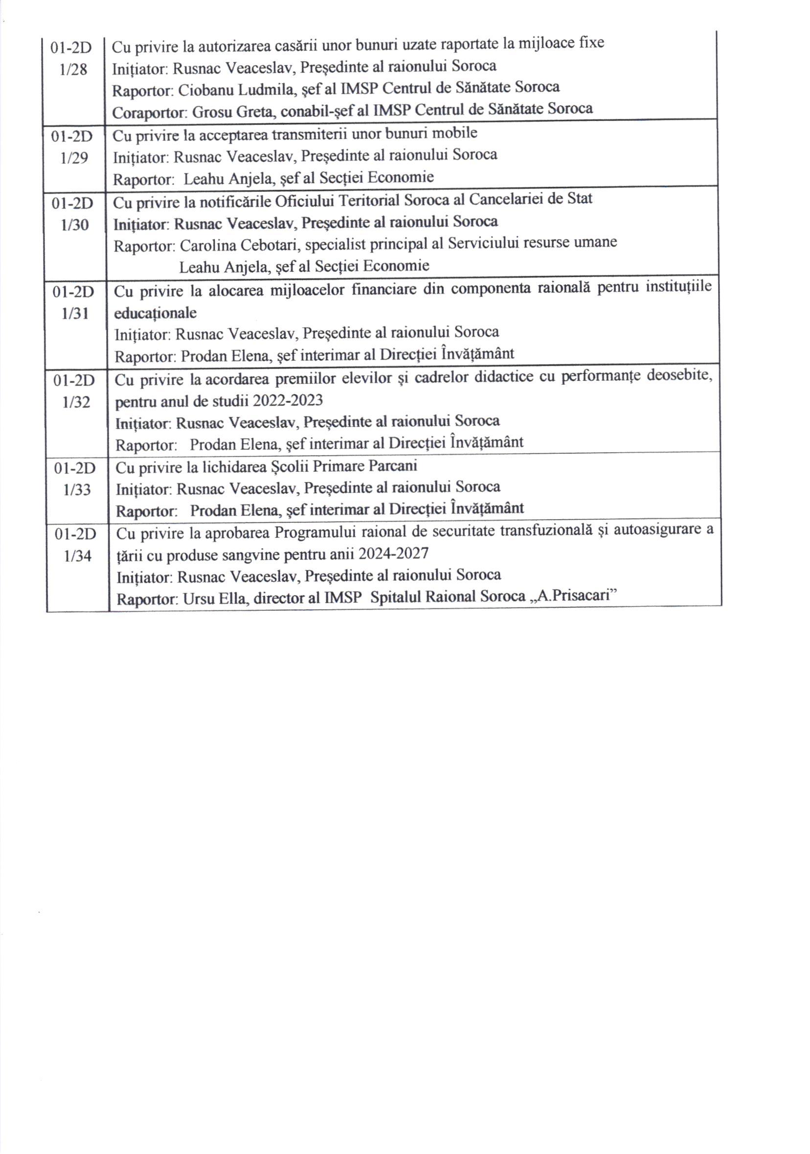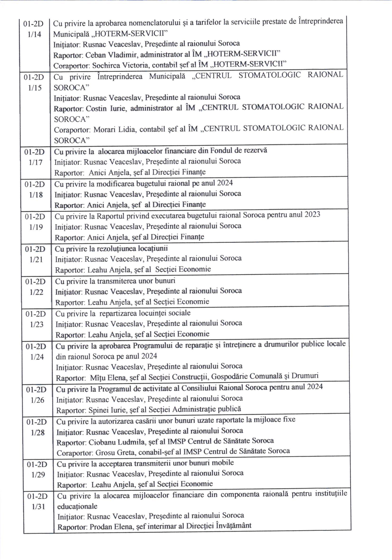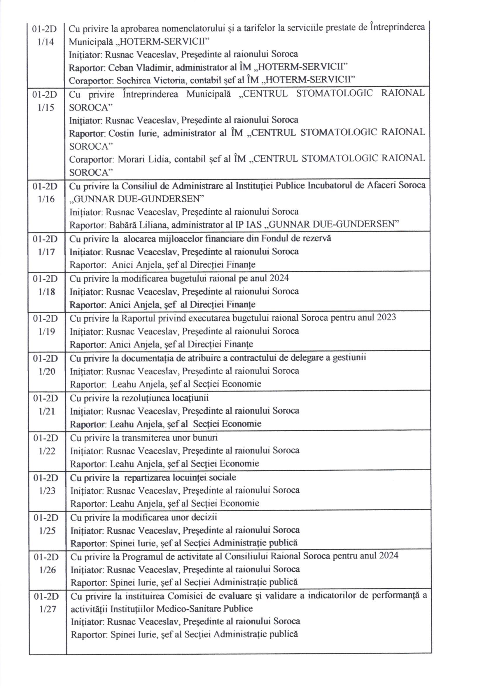 În conformitate cu prevederile art. 45 alin. (1) și (3) din Legea privind administrația publică locală nr. 436/2006, prin Dispoziția Președintelui raionului Soroca nr. 14 din 30 ianuarie 2024, Consiliul Raional Soroca se convoacă în ședință ordinară la data de 15 februarie 2024, ora 10.00, în sala de ședințe a Consiliului Raional Soroca.