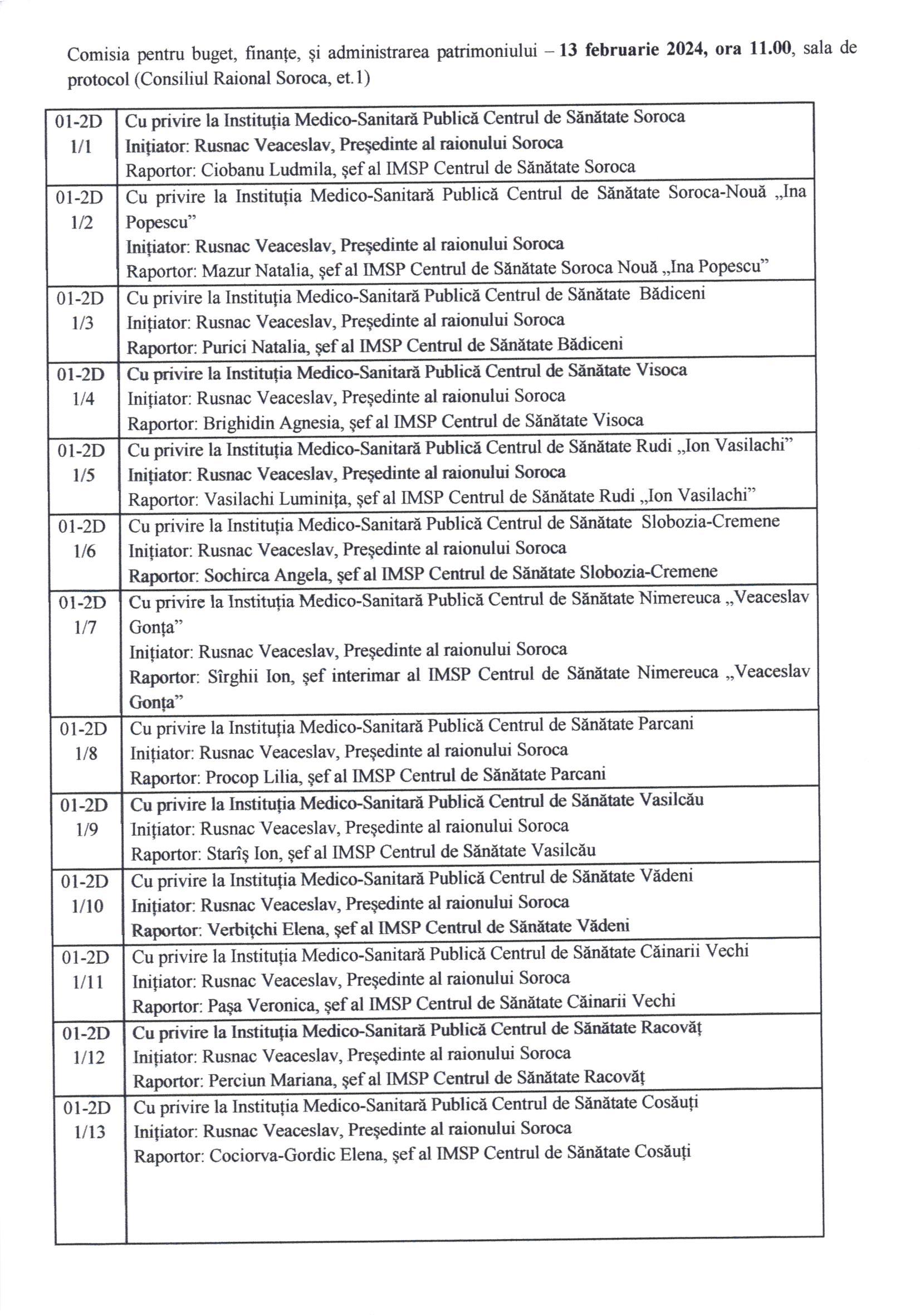 Comisia pentru buget, finanțe, și administrarea patrimoniului – 13 februarie 2024, ora 11.00, sala de protocol (Consiliul Raional Soroca, et.1)