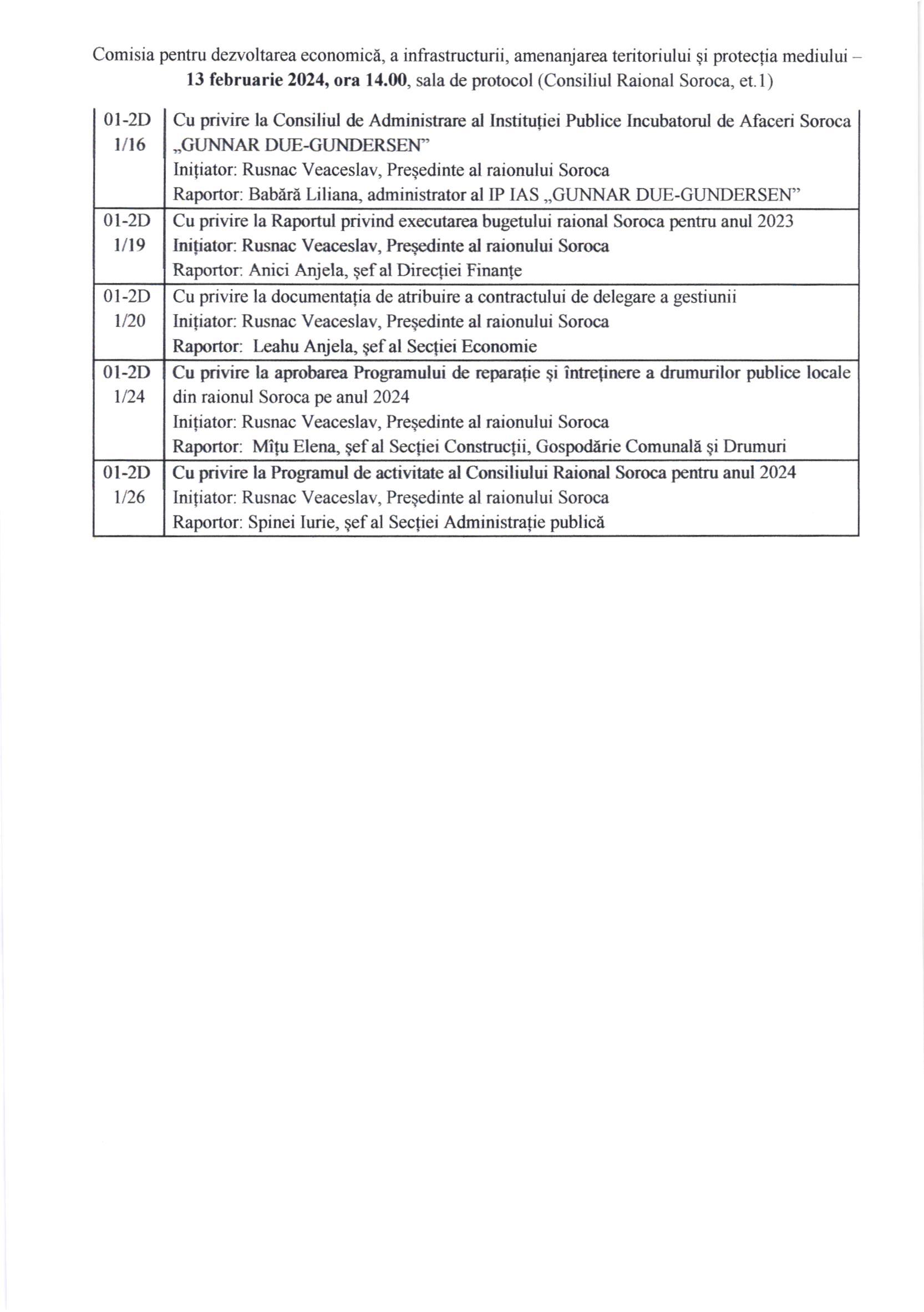 Comisia pentru dezvoltarea economică, a infrastructurii, amenanjarea teritoriului și protecția mediului – 13 februarie 2024, ora 14.00, sala de protocol (Consiliul Raional Soroca, et.1)