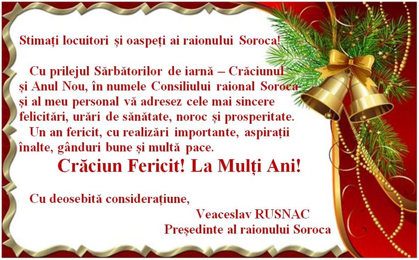 În numele Consiliului raional Soroca și al meu personal cu ocazia sărbătorii profesionale Vă adresez sincere urări de sănătate, bunăstare și prosperitate tuturor angajaților din cadrul administrației publice locale, exprimând înalta apreciere a activității Dumneavoastră pe tărâmul profesional în soluționarea problemelor cetățenilor şi dezvoltarea social-economică a și culturală a comunităților pe care le administrați.